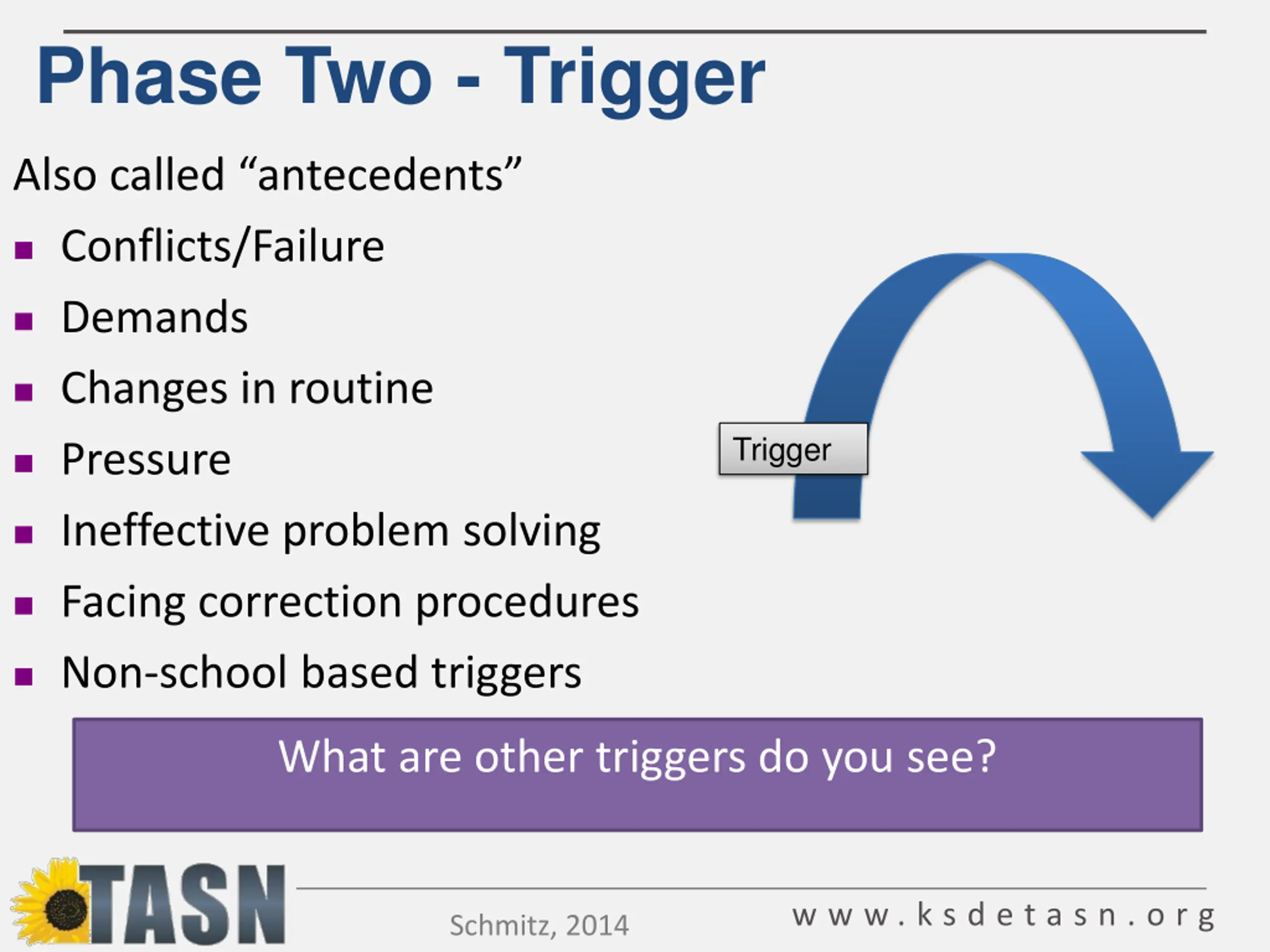 Phase Two - Trigger Also called antecedents Conflicts/Failure Demands Changes in routine Trigger Pressure Ineffective problem solving Facing correction procedures Non-school based triggers What are other triggers do you see? w w w . k s d e t a s n . o r g Schmitz, 2014