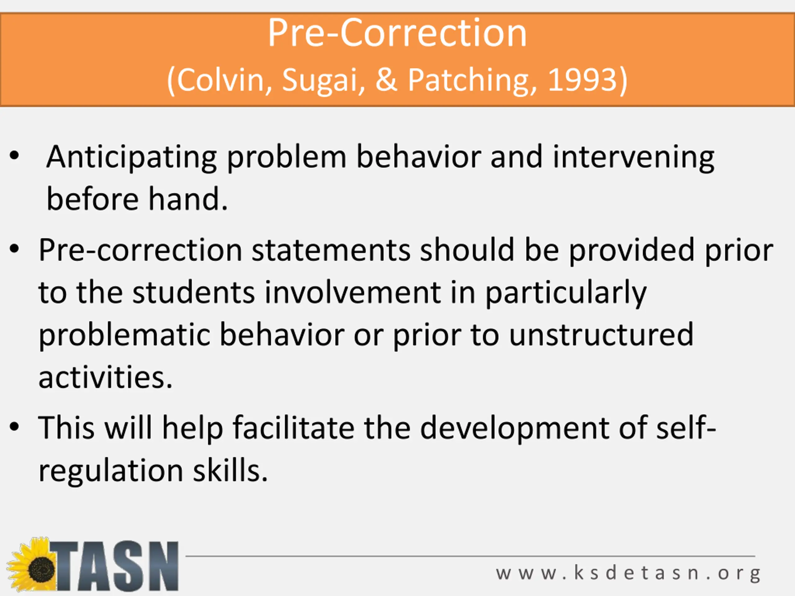 Pre-Correction (Colvin, Sugai, & Patching, 1993) Anticipating problem behavior and intervening before hand. Pre-correction statements should be provided prior to the students involvement in particularly problematic behavior or prior to unstructured activities. This will help facilitate the development of self- regulation skills. w w w . k s d e t a s n . o r g