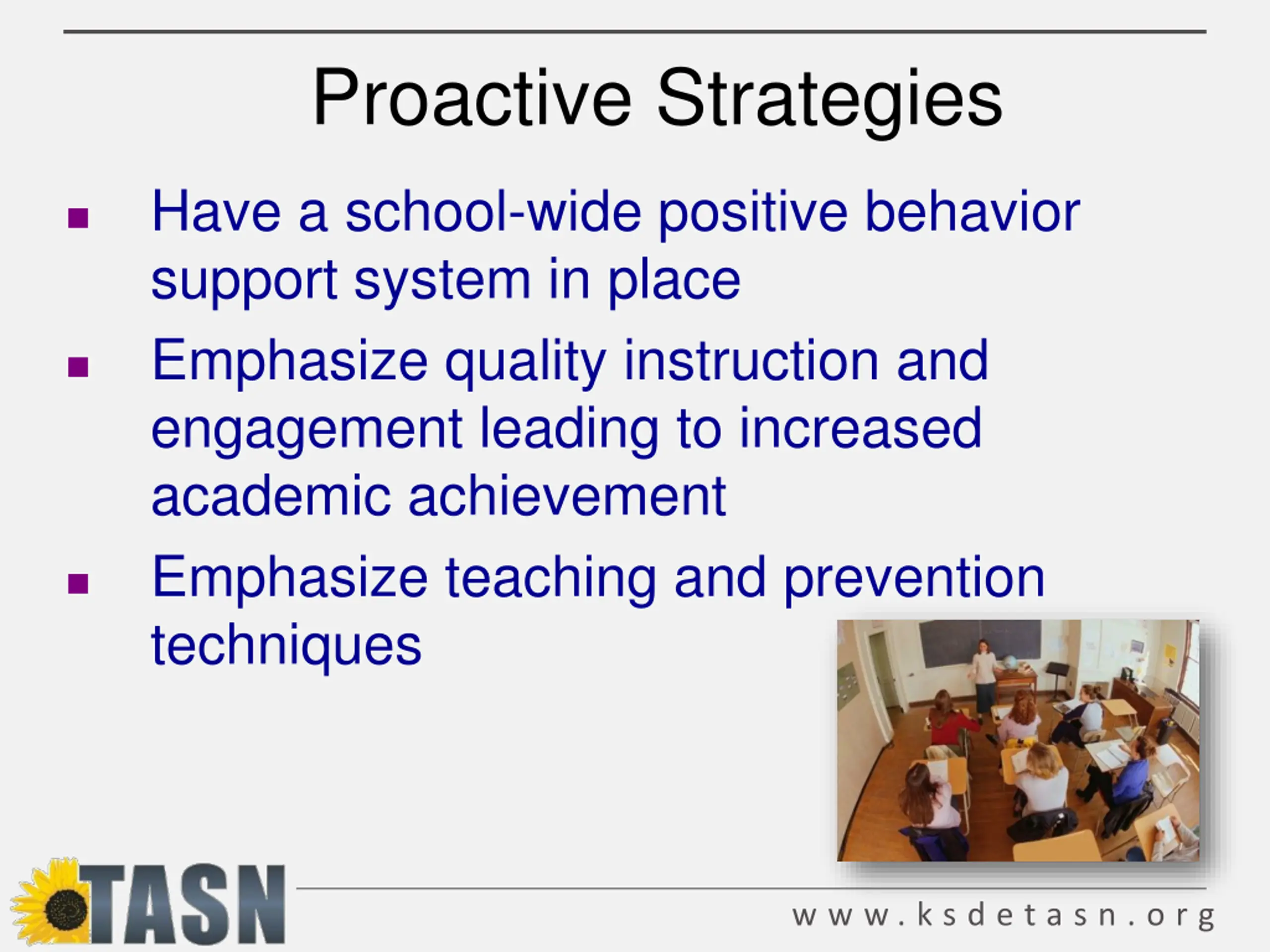 Proactive Strategies Have a school-wide positive behavior support system in place Emphasize quality instruction and engagement leading to increased academic achievement Emphasize teaching and prevention techniques w w w . k s d e t a s n . o r g