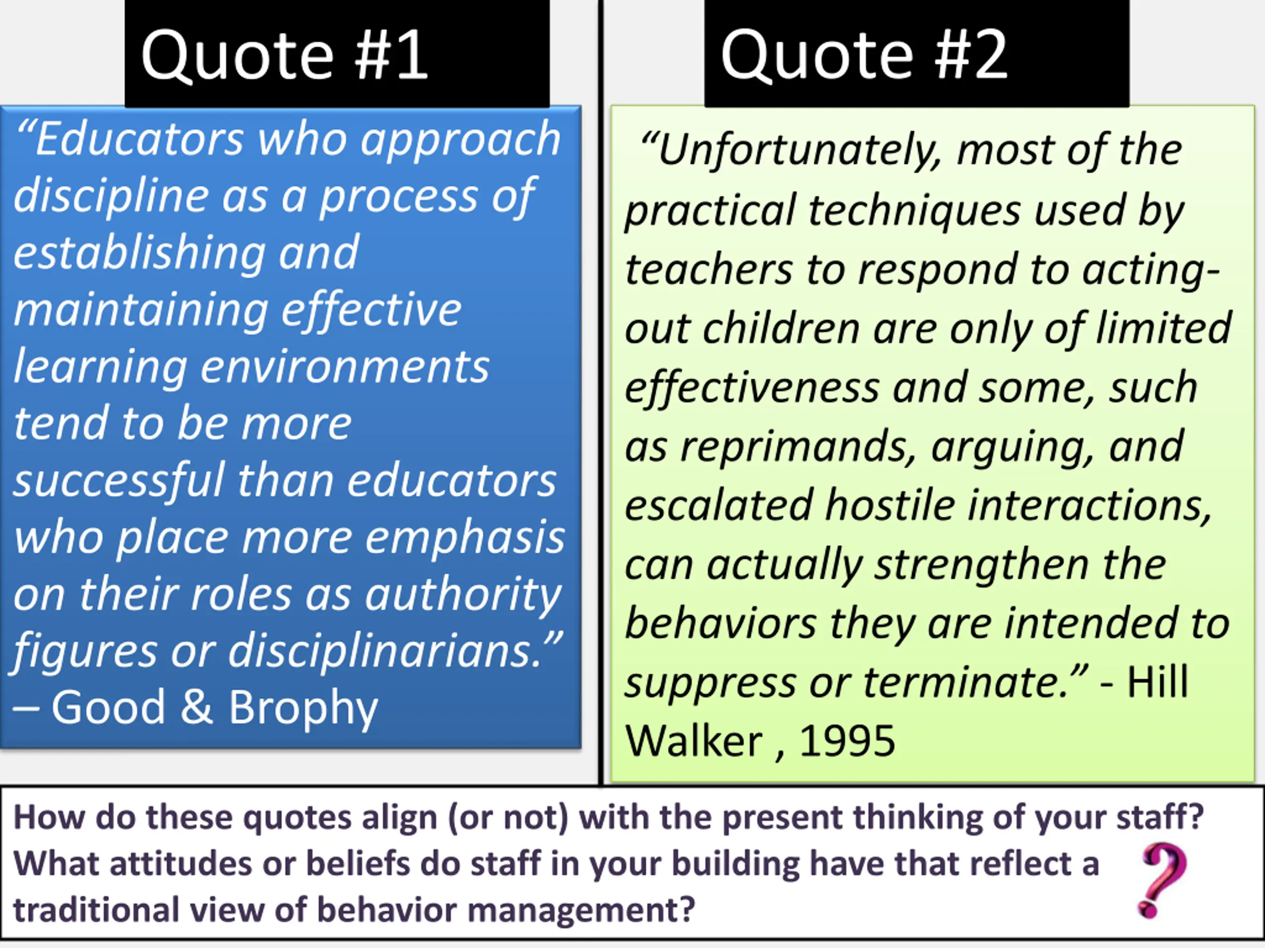 Quote #2 Quote #1 Educators who approach discipline as a process of establishing and maintaining effective learning environments tend to be more successful than educators who place more emphasis on their roles as authority figures or disciplinarians. Good & Brophy Unfortunately, most of the practical techniques used by teachers to respond to acting- out children are only of limited effectiveness and some, such as reprimands, arguing, and escalated hostile interactions, can actually strengthen the behaviors they are intended to suppress or terminate. - Hill Walker , 1995 How do these quotes align (or not) with the present thinking of your staff? What attitudes or beliefs do staff in your building have that reflect a traditional view of behavior management?