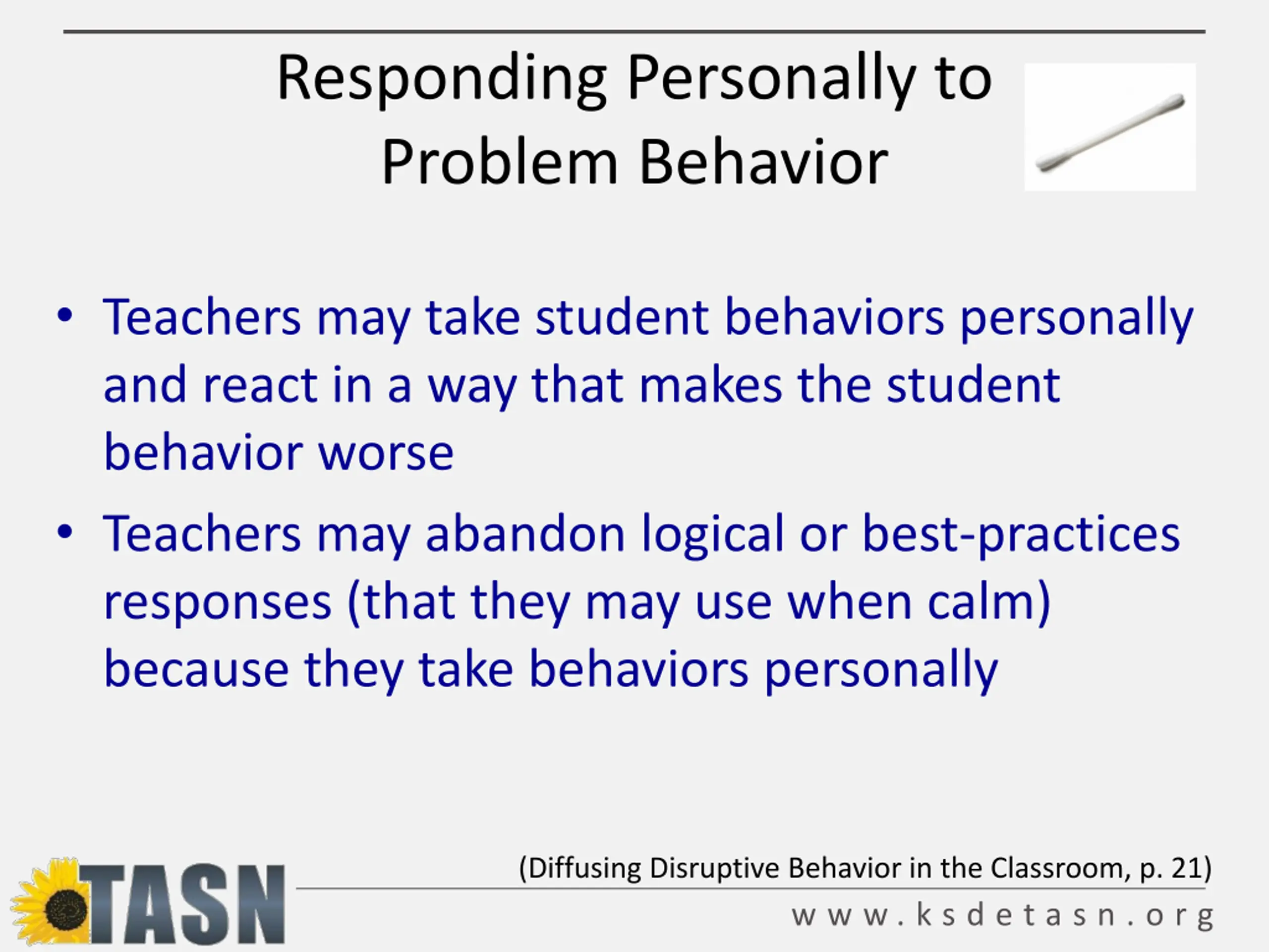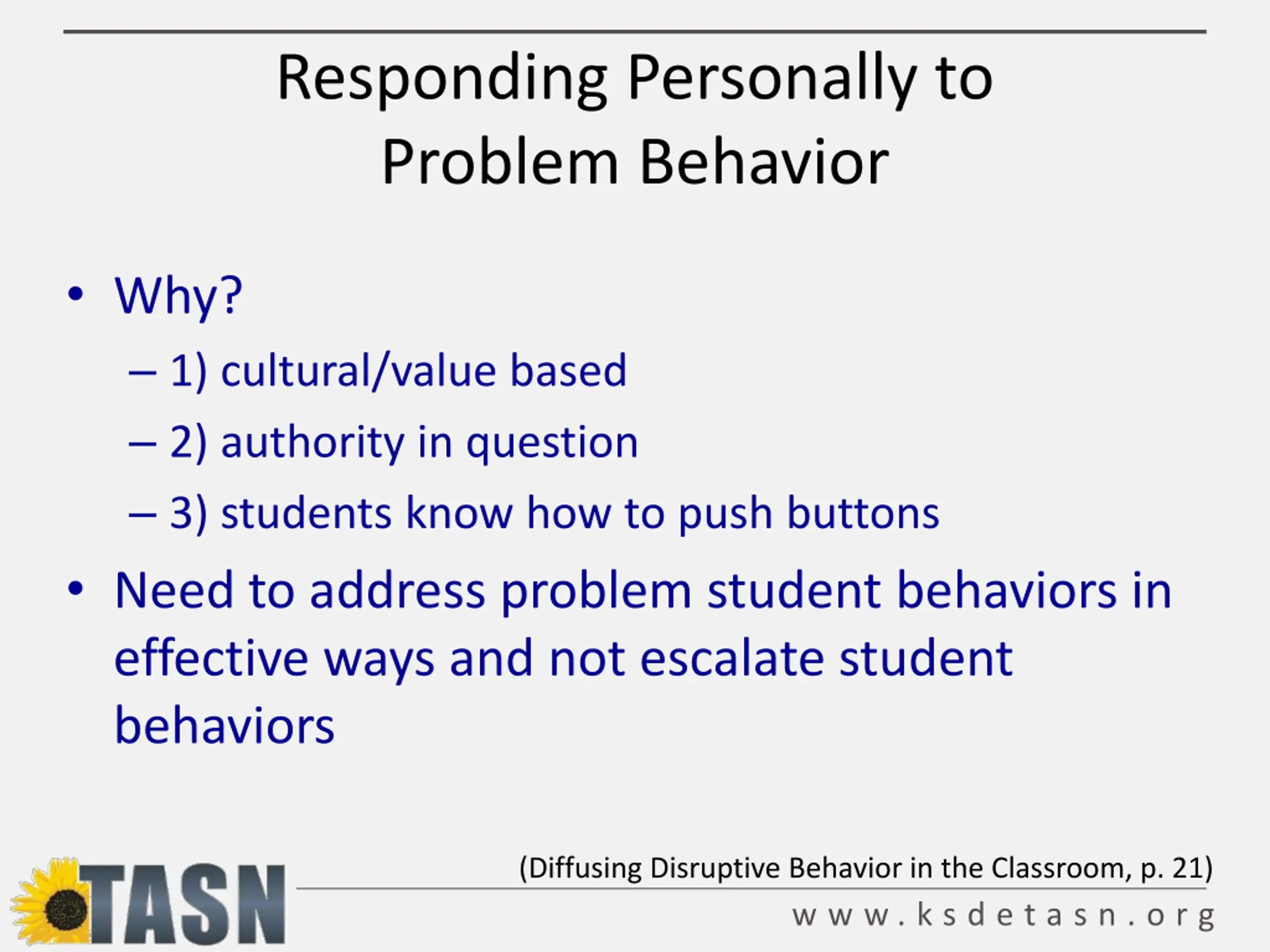 Responding Personally to Problem Behavior Teachers may take student behaviors personally and react in a way that makes the student behavior worse Teachers may abandon logical or best-practices responses (that they may use when calm) because they take behaviors personally (Diffusing Disruptive Behavior in the Classroom, p. 21) w w w . k s d e t a s n . o r g
