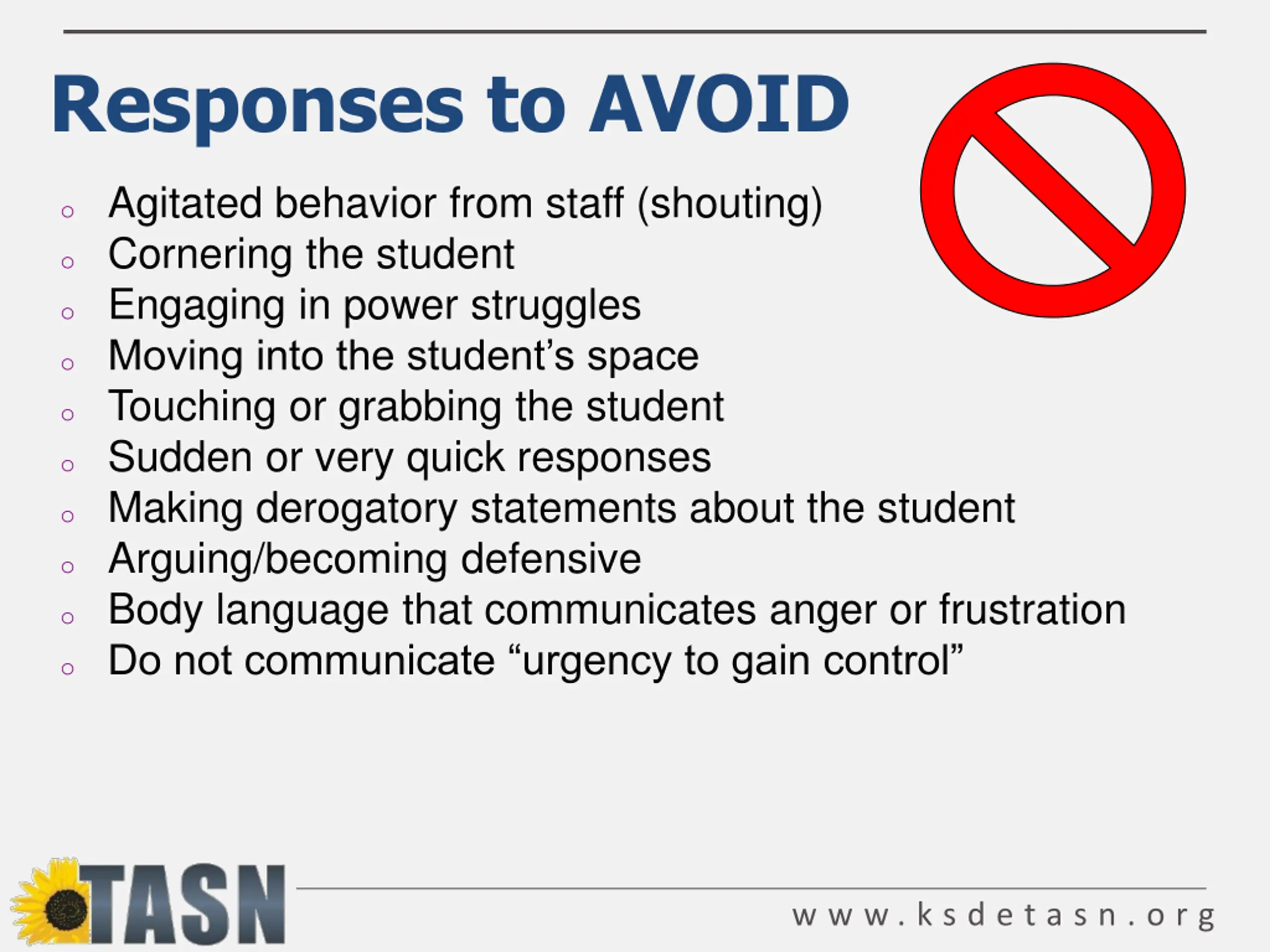 Responses to AVOID o Agitated behavior from staff (shouting) o Cornering the student o Engaging in power struggles o Moving into the student s space o Touching or grabbing the student o Sudden or very quick responses o Making derogatory statements about the student o Arguing/becoming defensive o Body language that communicates anger or frustration o Do not communicate urgency to gain control w w w . k s d e t a s n . o r g