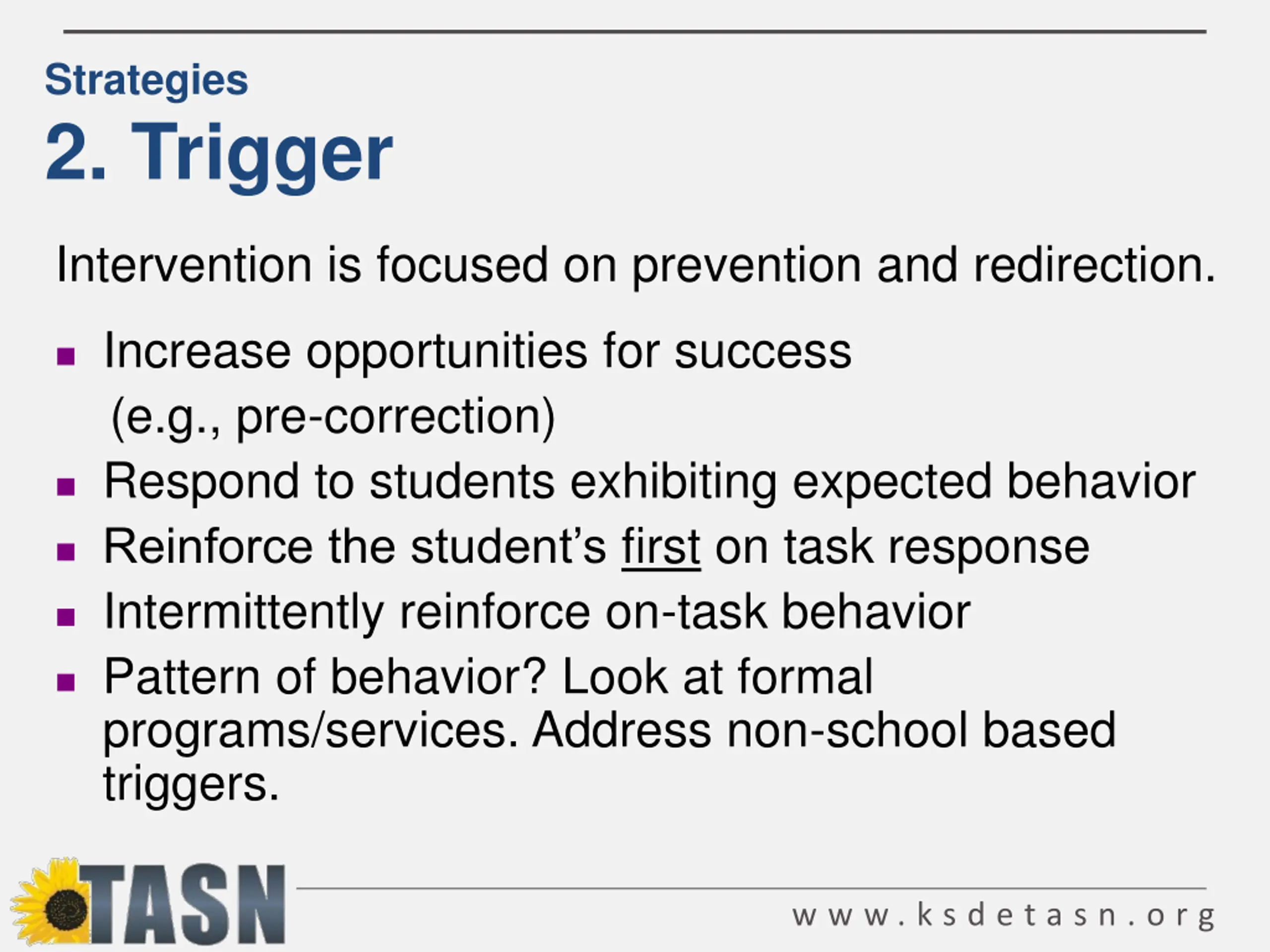 Strategies 2. Trigger Intervention is focused on prevention and redirection. Increase opportunities for success (e.g., pre-correction) Respond to students exhibiting expected behavior Reinforce the student s first on task response Intermittently reinforce on-task behavior Pattern of behavior? Look at formal programs/services. Address non-school based triggers. w w w . k s d e t a s n . o r g