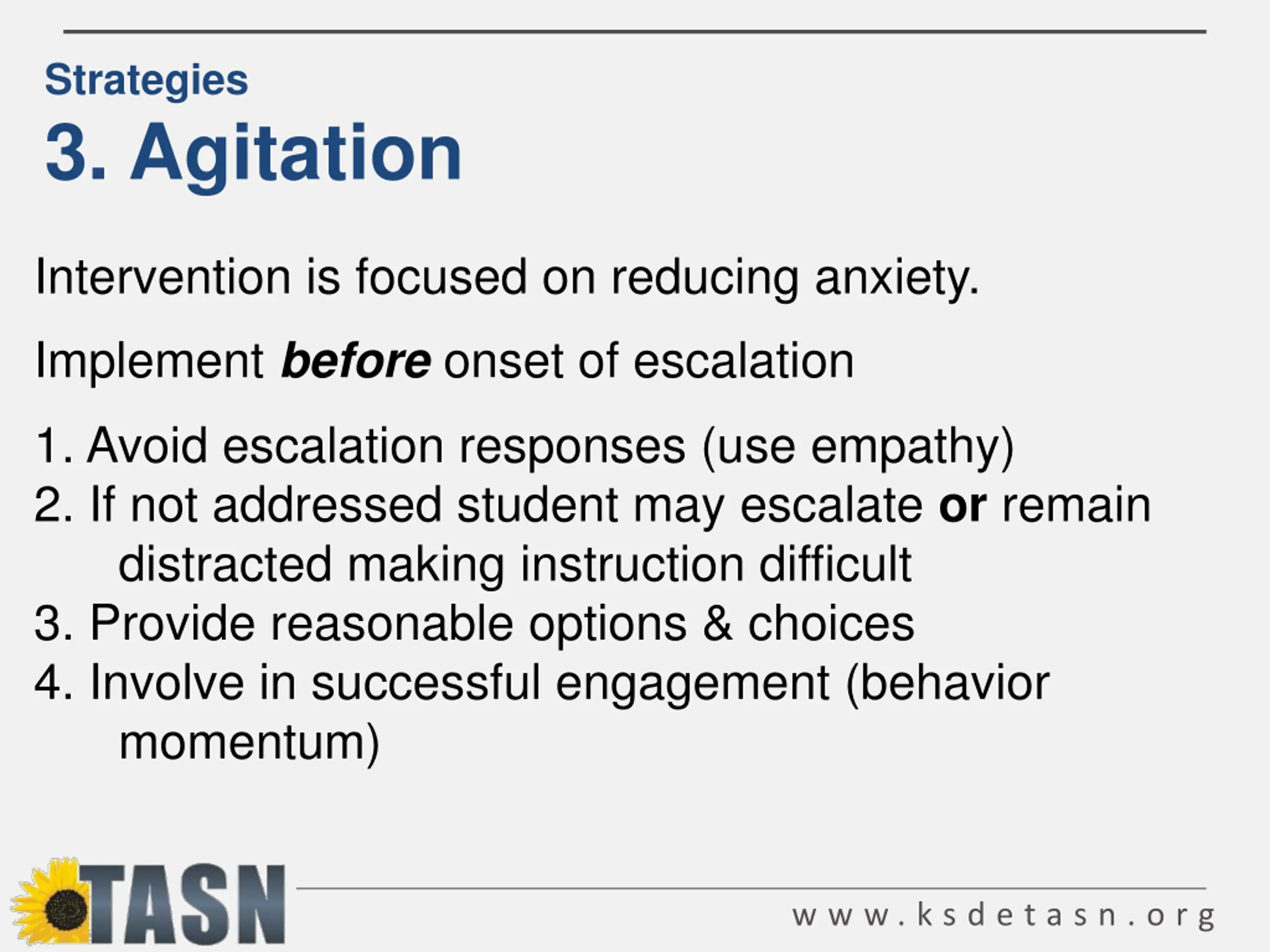 Strategies 3. Agitation Intervention is focused on reducing anxiety. Implement beforeonset of escalation 1. Avoid escalation responses (use empathy) 2. If not addressed student may escalate or remain distracted making instruction difficult 3. Provide reasonable options & choices 4. Involve in successful engagement (behavior momentum) w w w . k s d e t a s n . o r g
