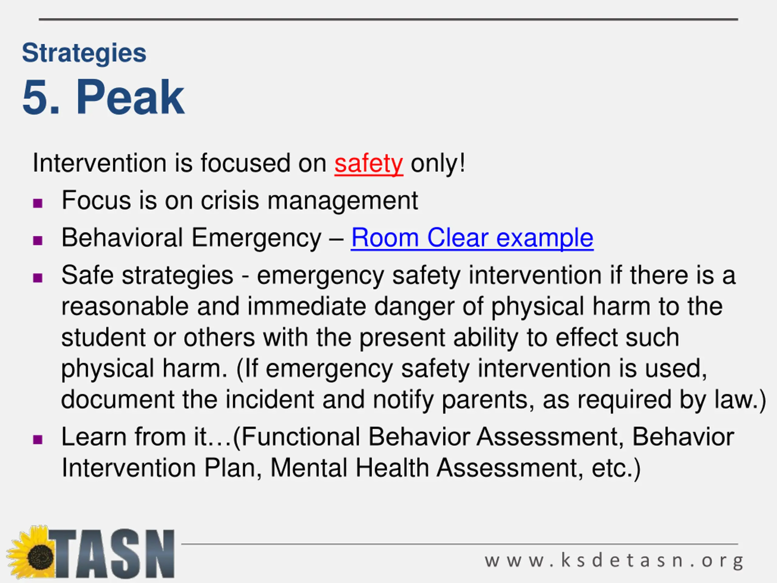 Strategies 5. Peak Intervention is focused on safety only! Focus is on crisis management Behavioral Emergency Room Clear example Safe strategies - emergency safety intervention if there is a reasonable and immediate danger of physical harm to the student or others with the present ability to effect such physical harm. (If emergency safety intervention is used, document the incident and notify parents, as required by law.) Learn from it (Functional Behavior Assessment, Behavior Intervention Plan, Mental Health Assessment, etc.) w w w . k s d e t a s n . o r g