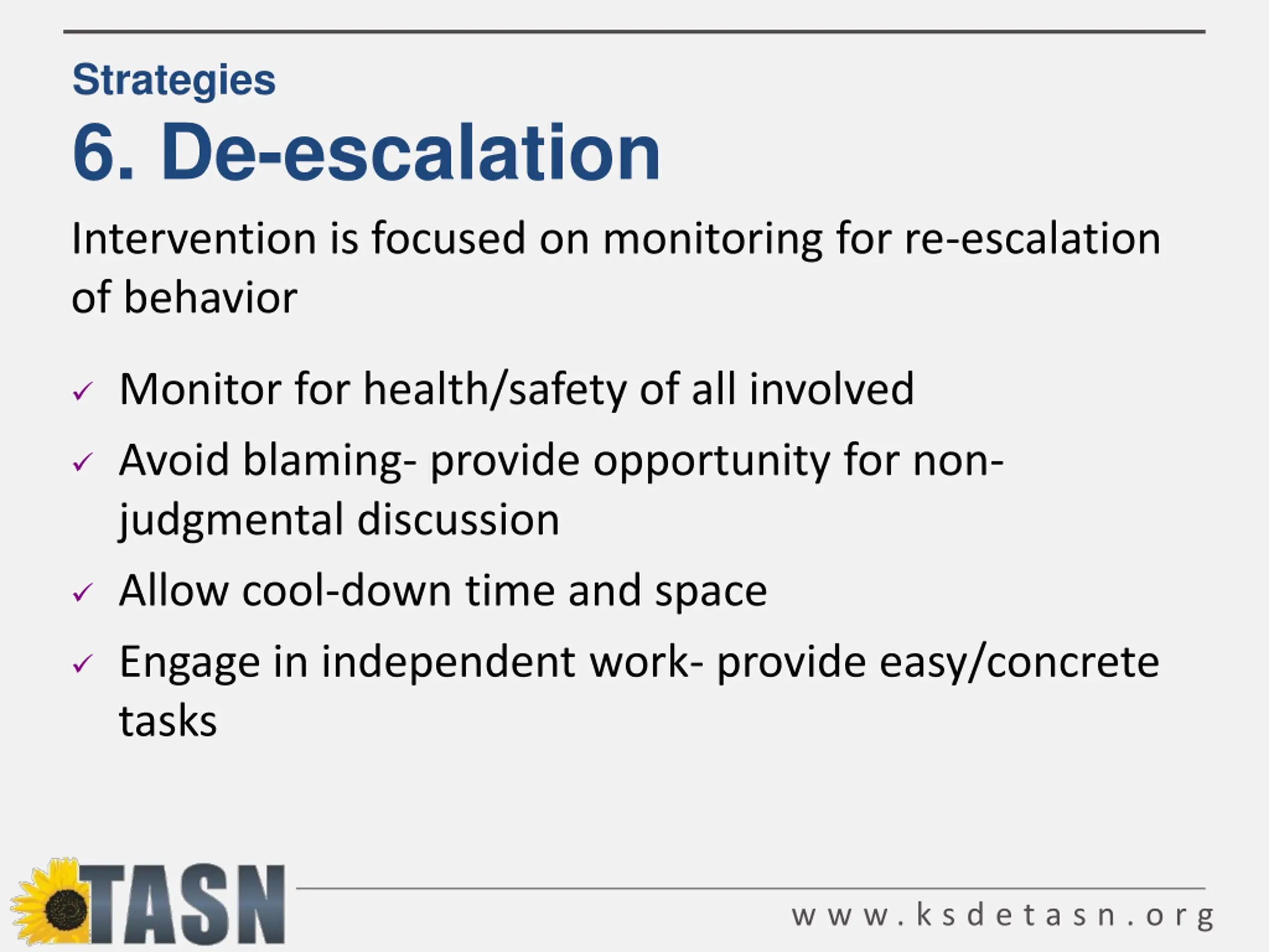 Strategies 6. De-escalation Intervention is focused on monitoring for re-escalation of behavior Monitor for health/safety of all involved Avoid blaming- provide opportunity for non- judgmental discussion Allow cool-down time and space Engage in independent work- provide easy/concrete tasks w w w . k s d e t a s n . o r g