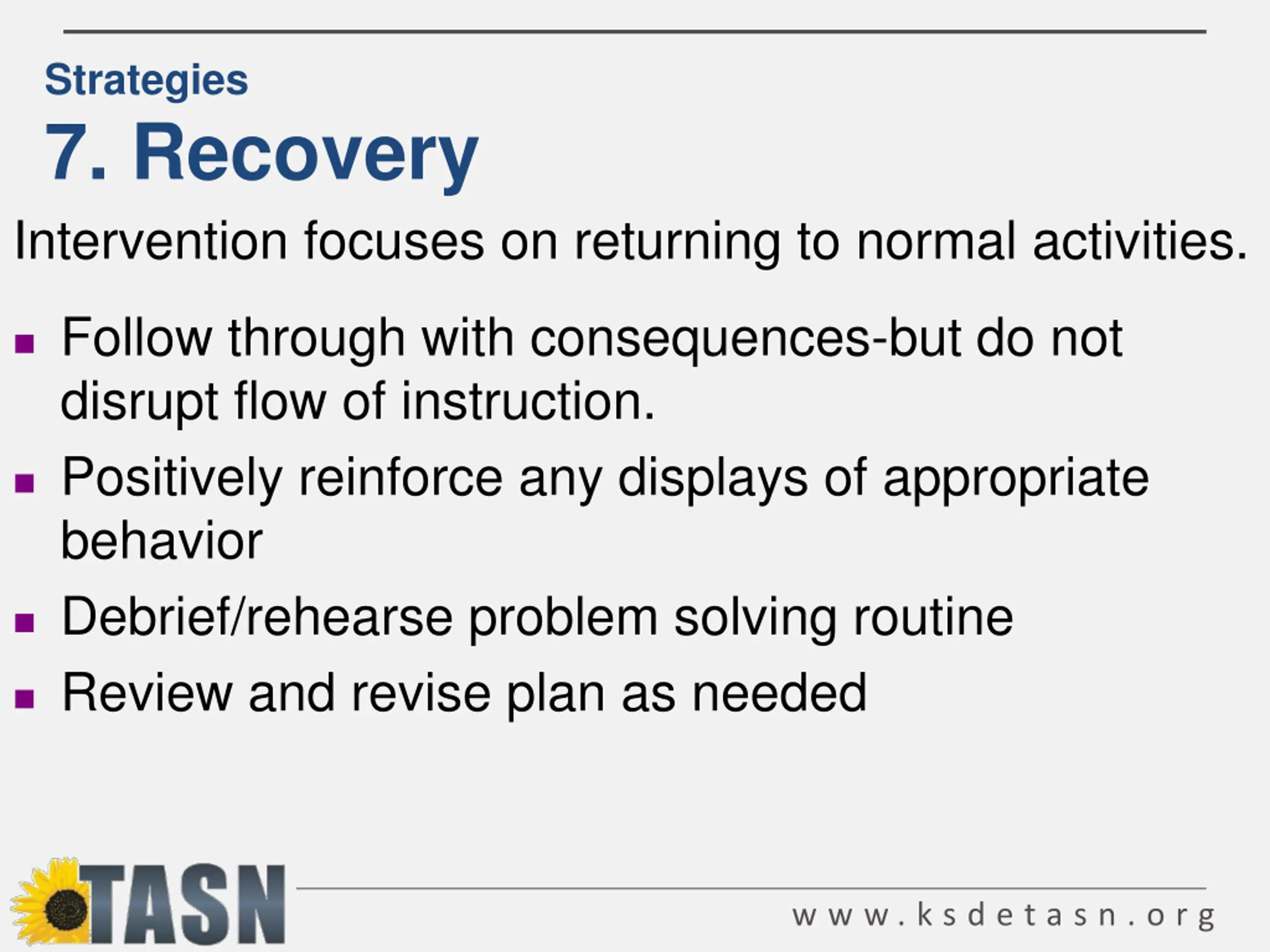 Strategies 7. Recovery Intervention focuses on returning to normal activities. Follow through with consequences-but do not disrupt flow of instruction. Positively reinforce any displays of appropriate behavior Debrief/rehearse problem solving routine Review and revise plan as needed w w w . k s d e t a s n . o r g