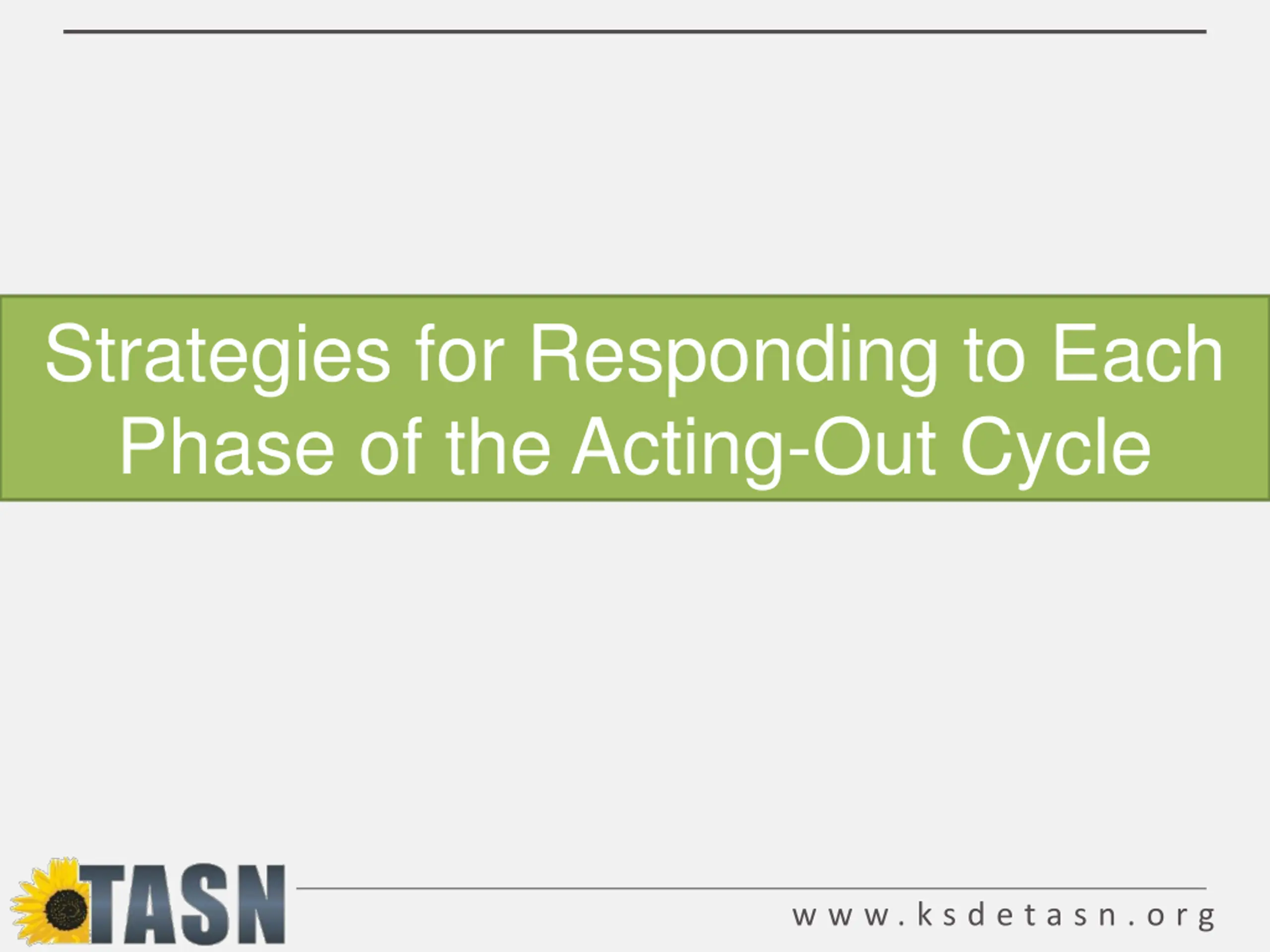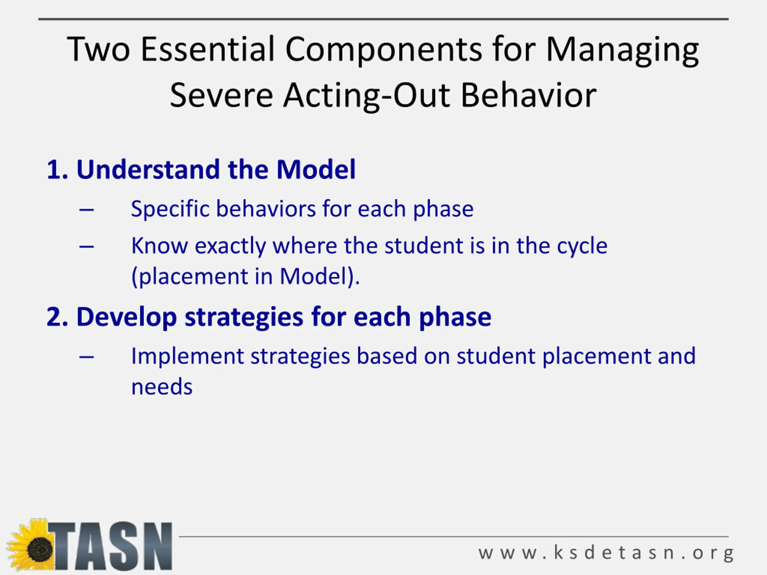 Two Essential Components for Managing Severe Acting-Out Behavior 1. Understand the Model Specific behaviors for each phase Know exactly where the student is in the cycle (placement in Model). 2. Develop strategies for each phase Implement strategies based on student placement and needs w w w . k s d e t a s n . o r g