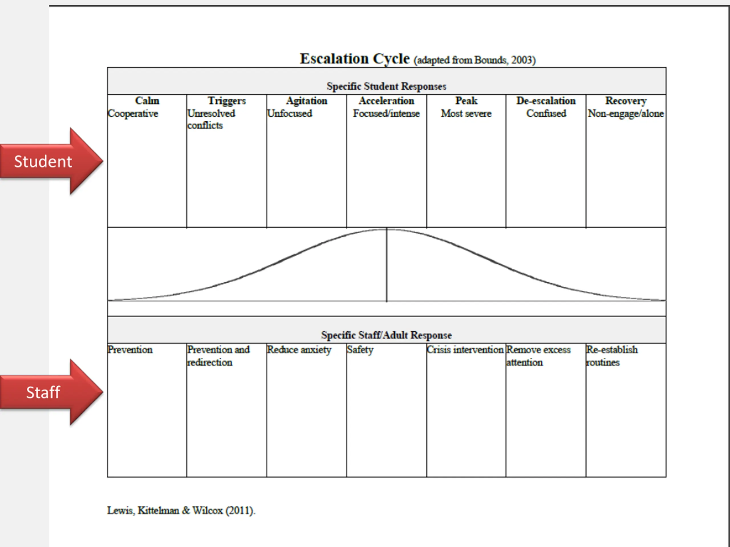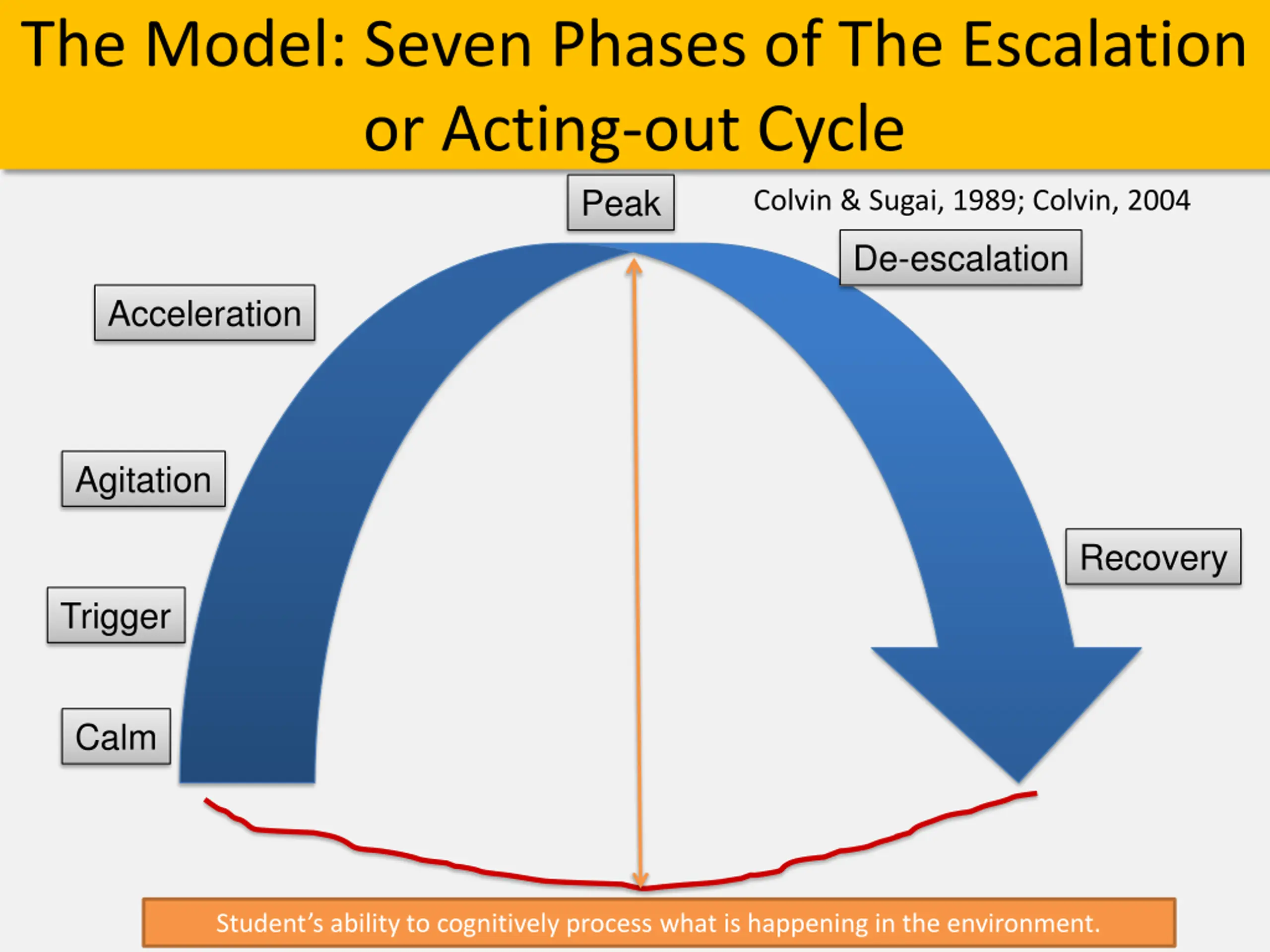 The Model: Seven Phases of The Escalation or Acting-out Cycle Peak Colvin & Sugai, 1989; Colvin, 2004 De-escalation Acceleration Agitation Recovery Trigger Calm Student s ability to cognitively process what is happening in the environment.