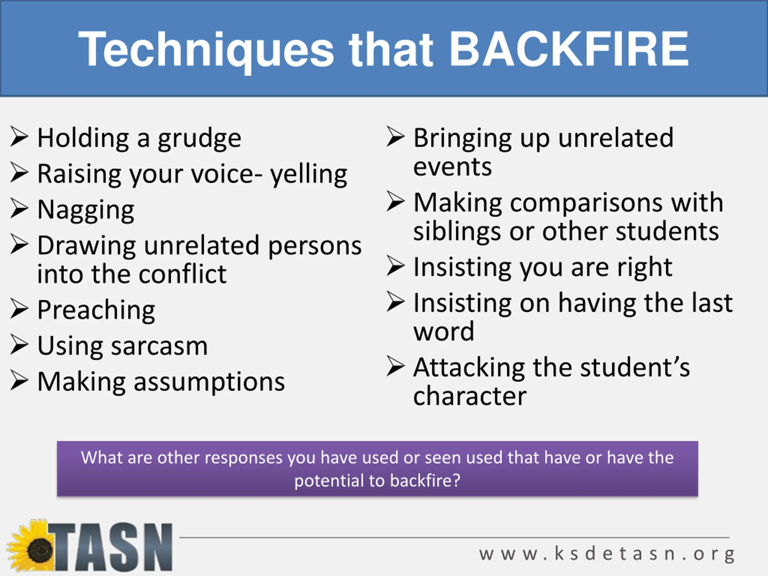 Techniques that BACKFIRE Holding a grudge Raising your voice- yelling Nagging Drawing unrelated persons into the conflict Preaching Using sarcasm Making assumptions Bringing up unrelated events Making comparisons with siblings or other students Insisting you are right Insisting on having the last word Attacking the student s character What are other responses you have used or seen used that have or have the potential to backfire? w w w . k s d e t a s n . o r g