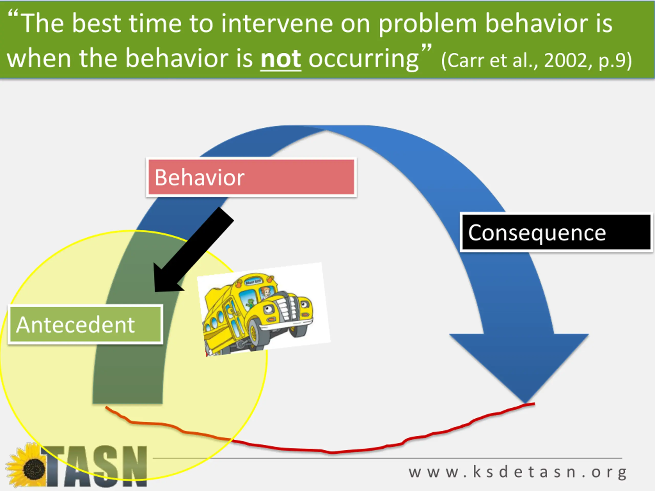 The best time to intervene on problem behavior is when the behavior is not occurring (Carr et al., 2002, p.9) Behavior Consequence Antecedent w w w . k s d e t a s n . o r g