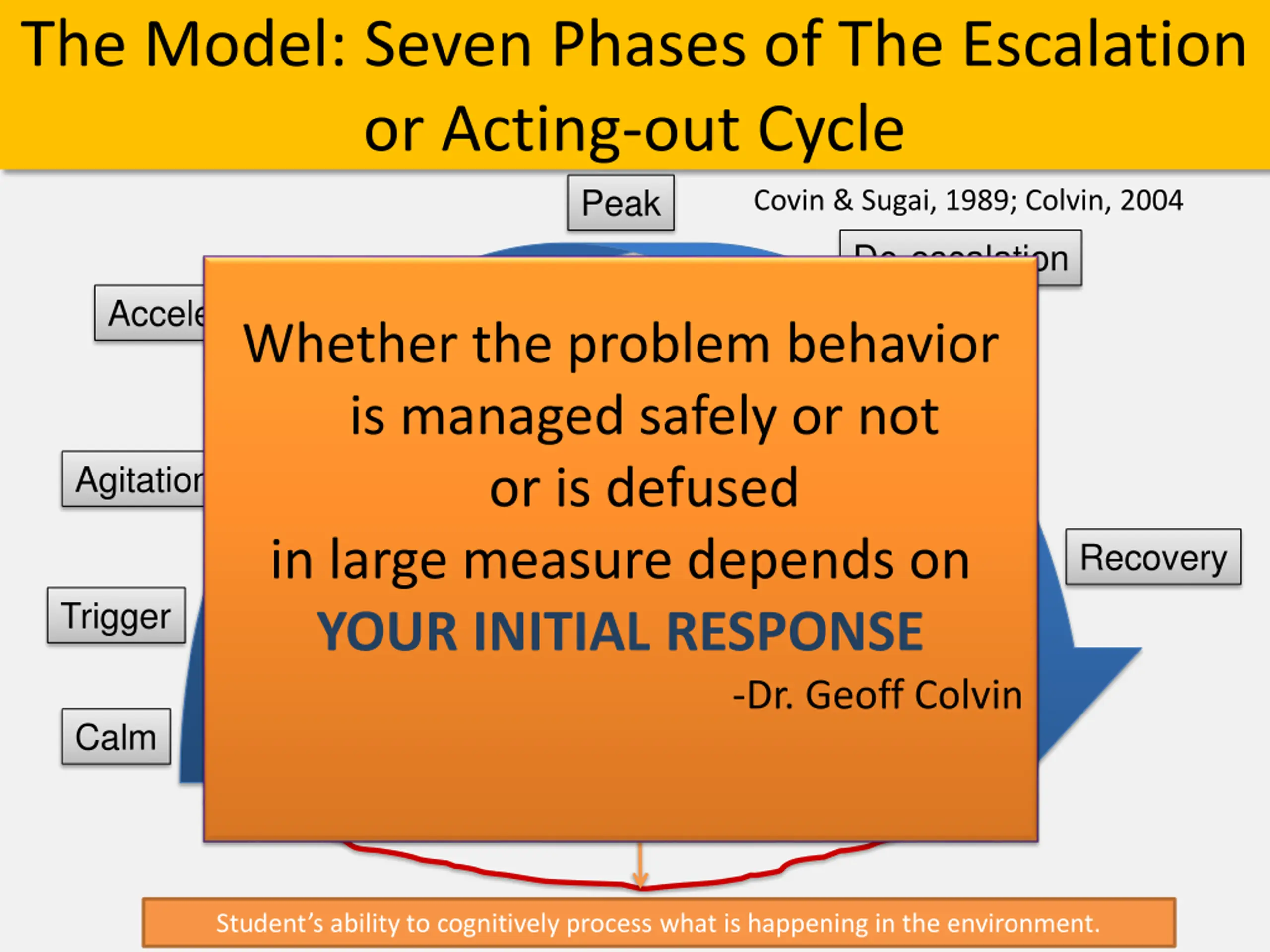 The Model: Seven Phases of The Escalation or Acting-out Cycle Peak Covin & Sugai, 1989; Colvin, 2004 De-escalation Acceleration Whether the problem behavior is managed safely or not or is defused in large measure depends on YOUR INITIAL RESPONSE Agitation Recovery Trigger -Dr. Geoff Colvin Calm Student s ability to cognitively process what is happening in the environment.