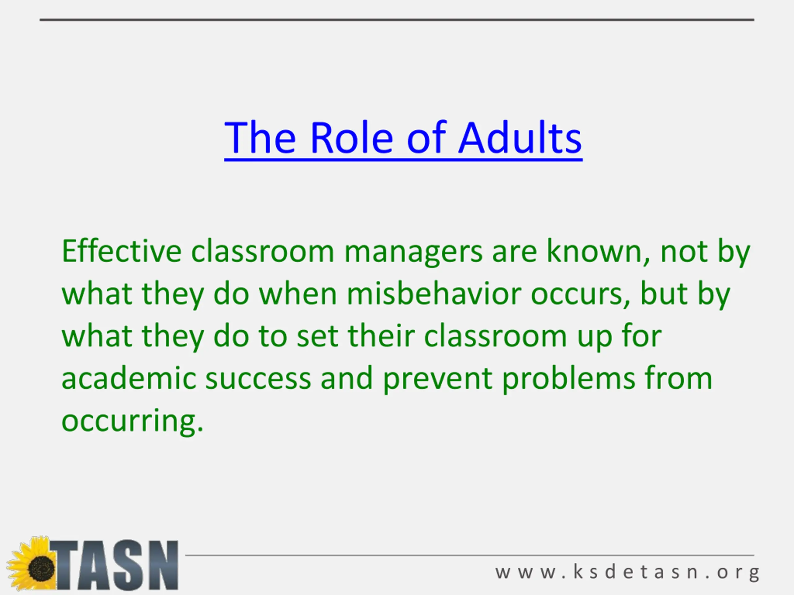 The Role of Adults Effective classroom managers are known, not by what they do when misbehavior occurs, but by what they do to set their classroom up for academic success and prevent problems from occurring. w w w . k s d e t a s n . o r g