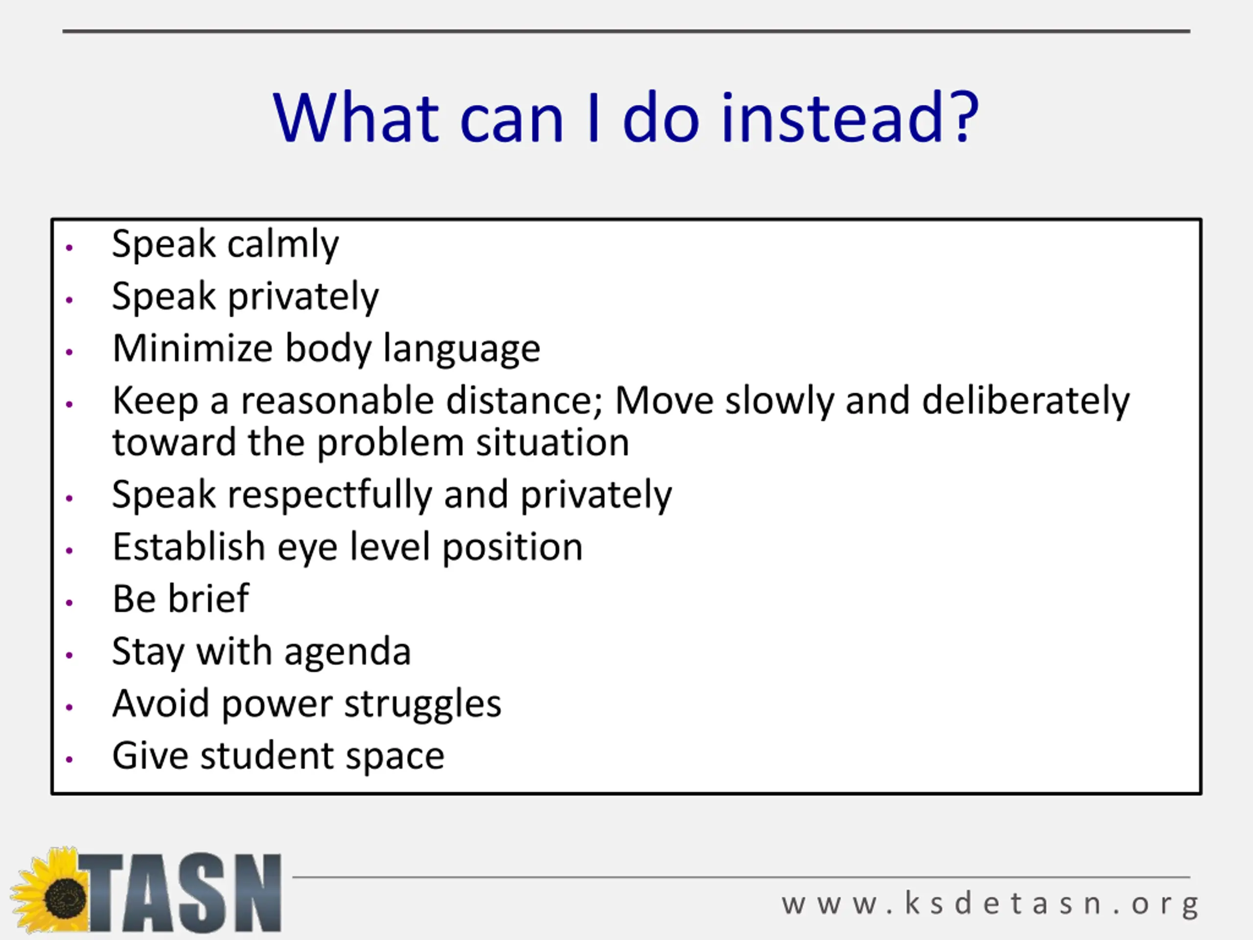 What can I do instead? Speak calmly Speak privately Minimize body language Keep a reasonable distance; Move slowly and deliberately toward the problem situation Speak respectfully and privately Establish eye level position Be brief Stay with agenda Avoid power struggles Give student space w w w . k s d e t a s n . o r g