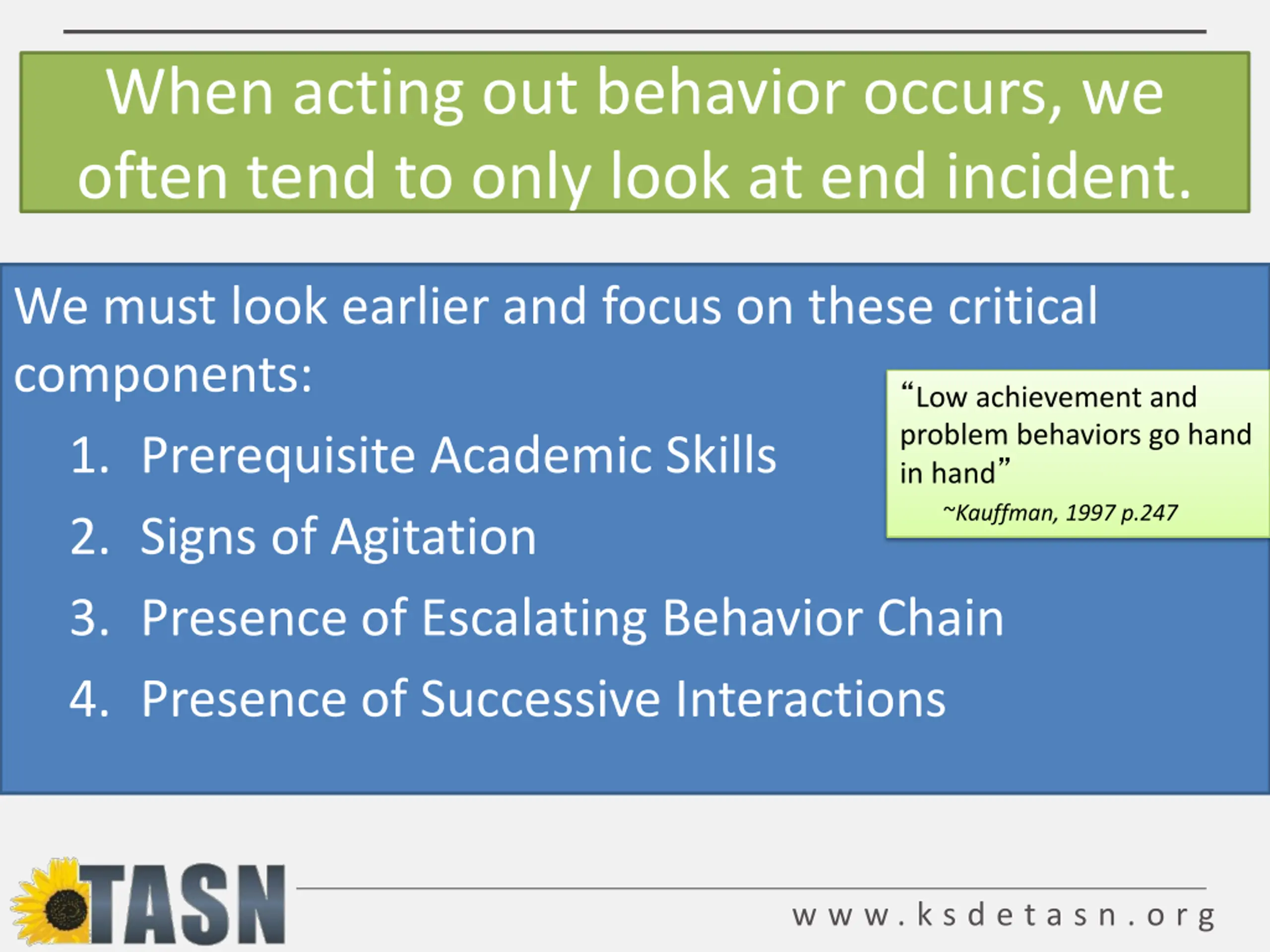 When acting out behavior occurs, we often tend to only look at end incident. We must look earlier and focus on these critical components: 1. Prerequisite Academic Skills 2. Signs of Agitation 3. Presence of Escalating Behavior Chain 4. Presence of Successive Interactions Low achievement and problem behaviors go hand in hand ~Kauffman, 1997 p.247 w w w . k s d e t a s n . o r g
