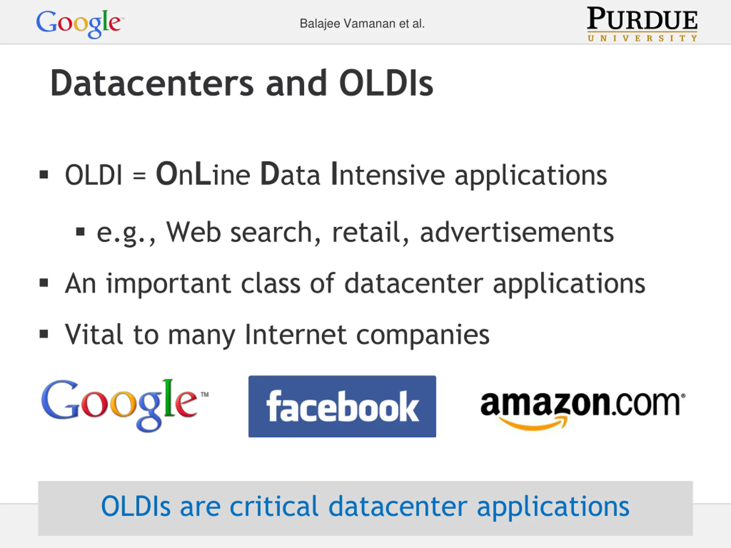 Balajee Vamanan et al. Datacenters and OLDIs OLDI = OnLine Data Intensive applications e.g., Web search, retail, advertisements An important class of datacenter applications Vital to many Internet companies OLDIs are critical datacenter applications