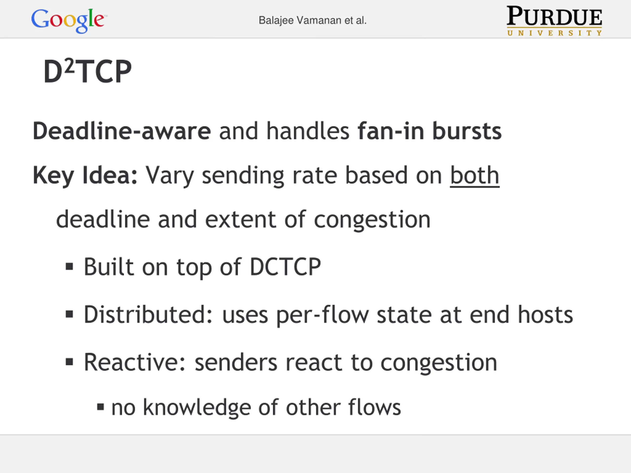 Balajee Vamanan et al. D2TCP Deadline-aware and handles fan-in bursts Key Idea: Vary sending rate based on both deadline and extent of congestion Built on top of DCTCP Distributed: uses per-flow state at end hosts Reactive: senders react to congestion no knowledge of other flows