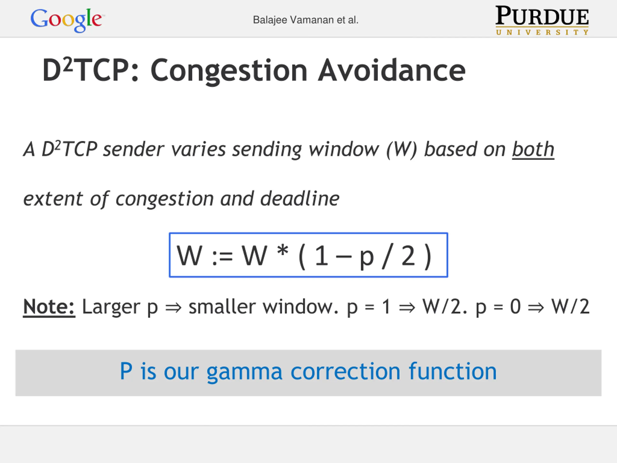 Balajee Vamanan et al. D2TCP: Congestion Avoidance A D2TCP sender varies sending window (W) based on both extent of congestion and deadline W := W * ( 1 p / 2 ) Note: Larger p smaller window. p = 1 W/2. p = 0 W/2 P is our gamma correction function