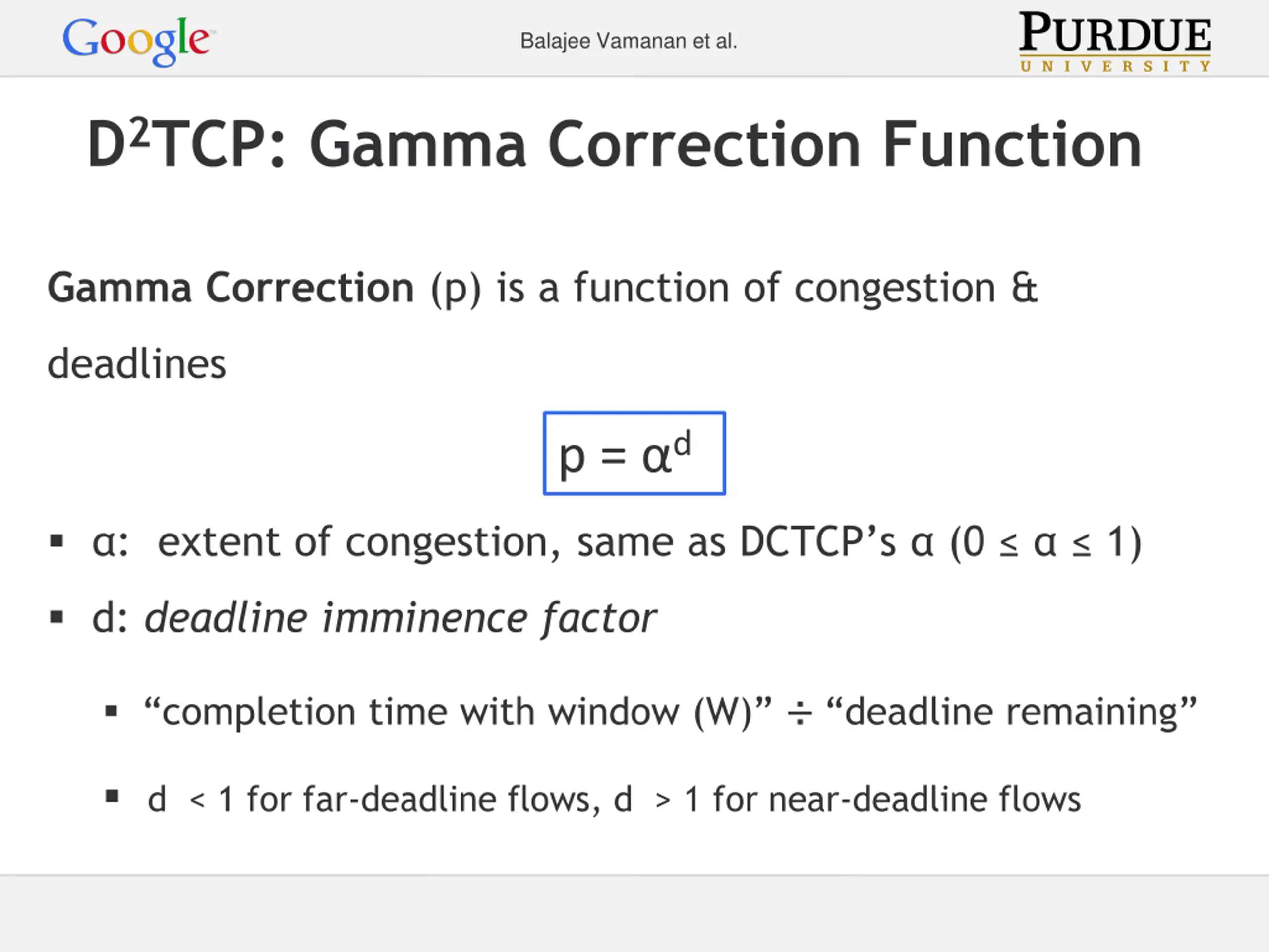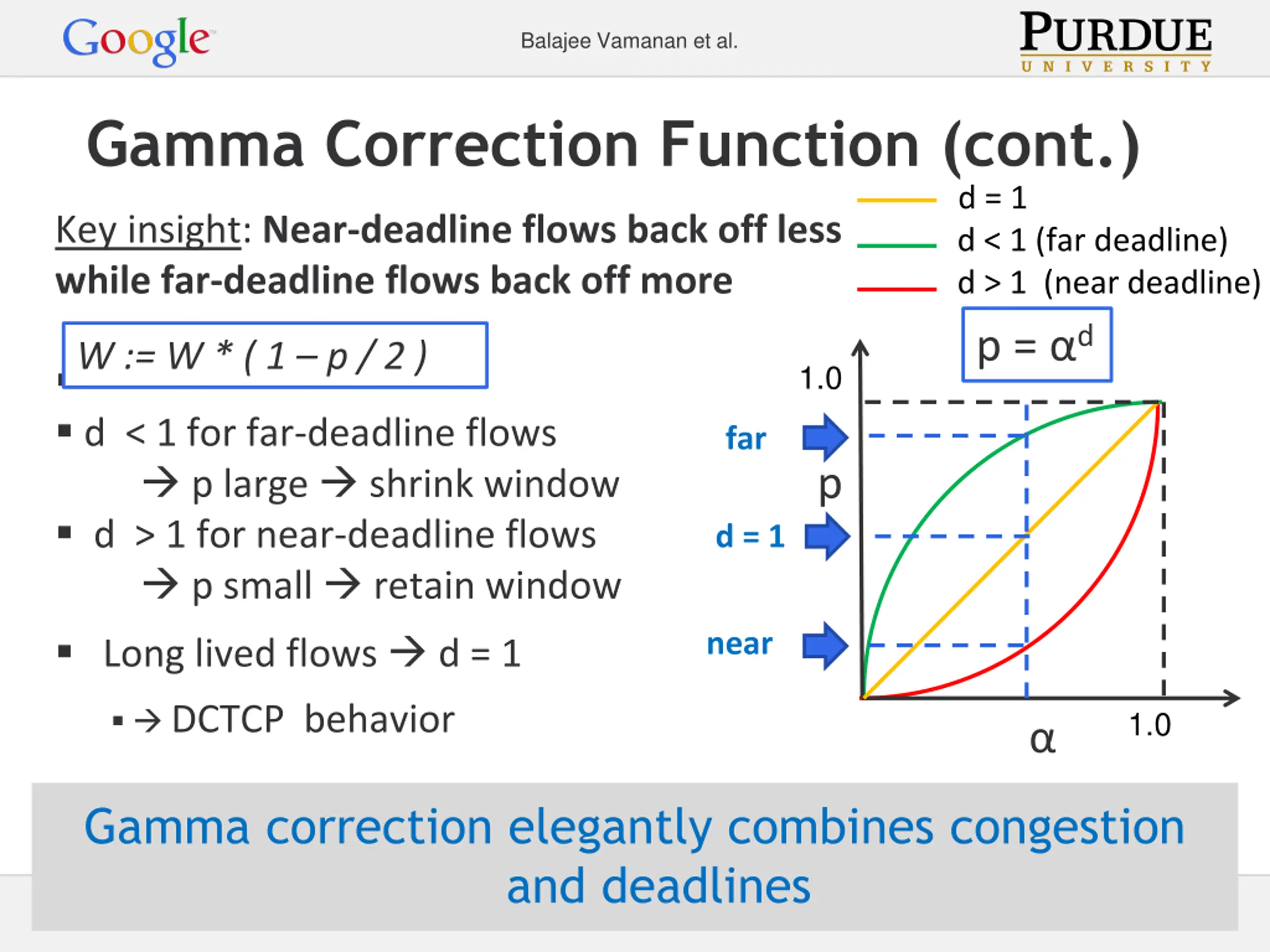 Balajee Vamanan et al. D2TCP: Gamma Correction Function Gamma Correction (p) is a function of congestion & deadlines p = d : extent of congestion, same as DCTCP s (0 1) d: deadline imminence factor completion time with window (W) deadline remaining d < 1 for far-deadline flows, d > 1 for near-deadline flows