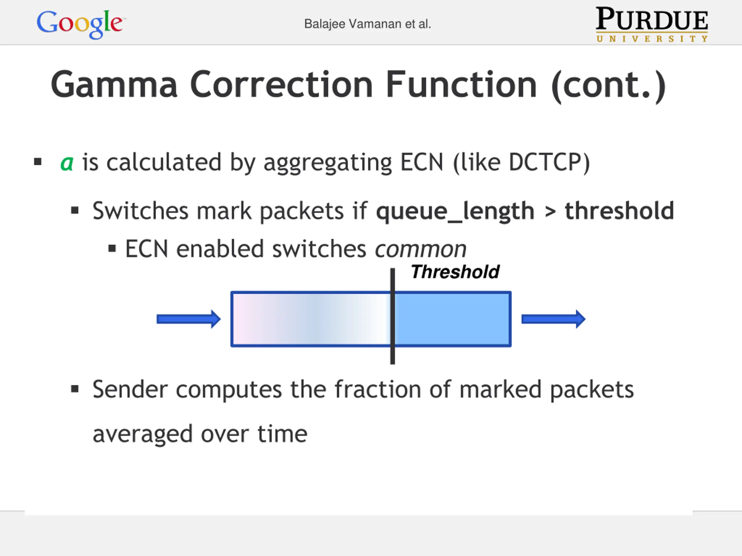 Balajee Vamanan et al. Gamma Correction Function (cont.) is calculated by aggregating ECN (like DCTCP) Switches mark packets if queue_length > threshold ECN enabled switches common Threshold Sender computes the fraction of marked packets averaged over time