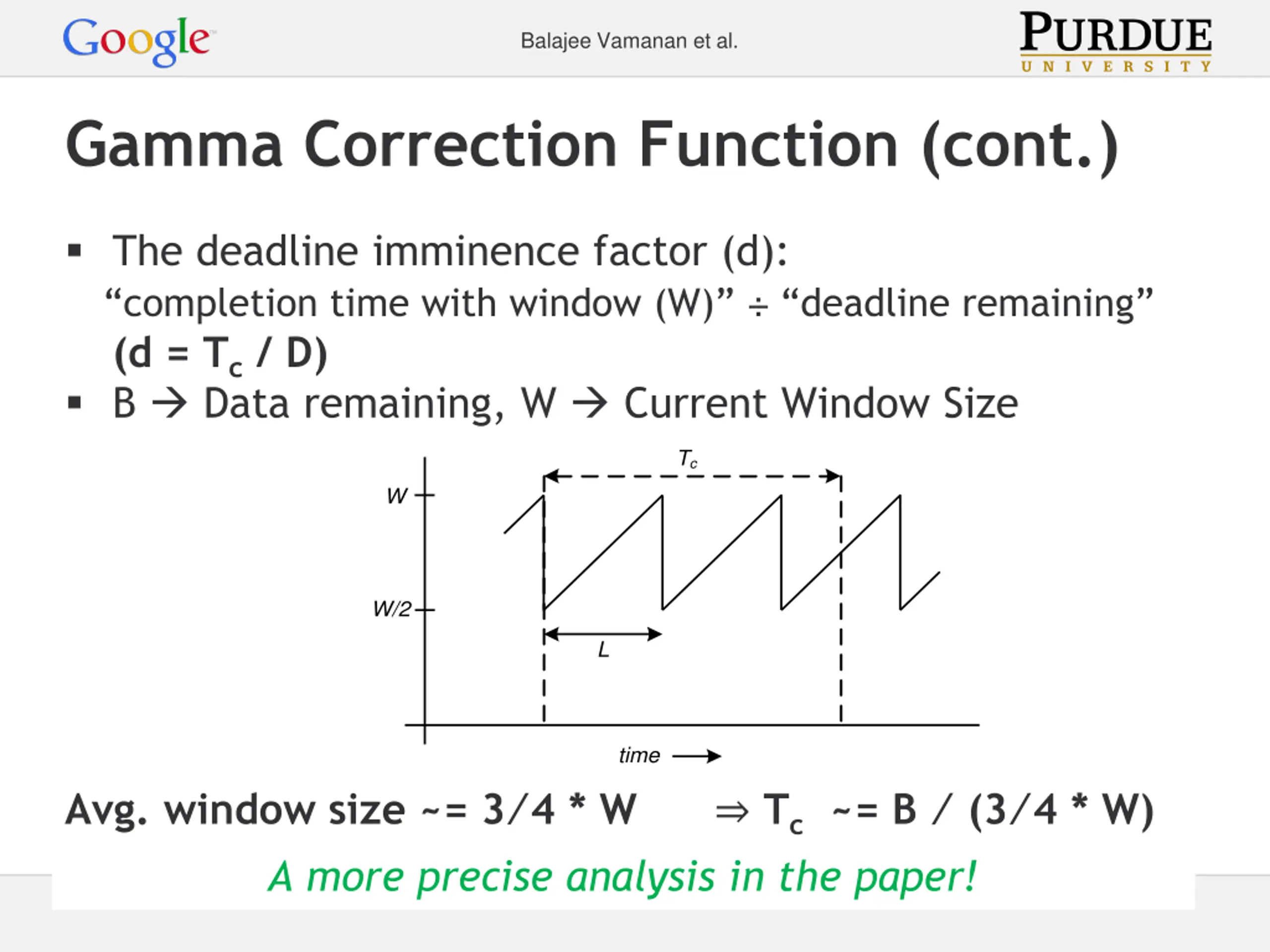 Balajee Vamanan et al. Gamma Correction Function (cont.) The deadline imminence factor (d): completion time with window (W) deadline remaining (d = Tc/ D) B Data remaining, W Current Window Size Tc W W/2 L time Avg. window size ~= 3 4 * W Tc~= B (3 4 * W) A more precise analysis in the paper!