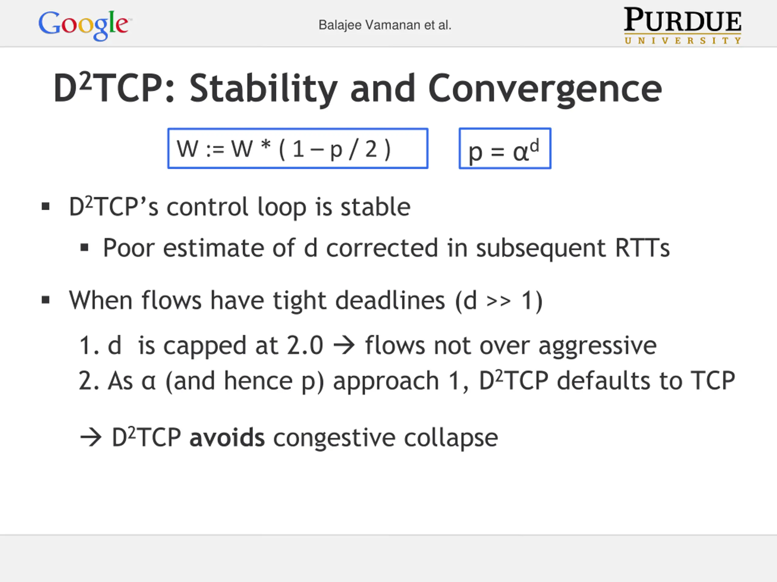 Balajee Vamanan et al. D2TCP: Stability and Convergence p = d W := W * ( 1 p / 2 ) D2TCP s control loop is stable Poor estimate of d corrected in subsequent RTTs When flows have tight deadlines (d >> 1) 1. d is capped at 2.0 flows not over aggressive 2. As (and hence p) approach 1, D2TCP defaults to TCP D2TCP avoids congestive collapse