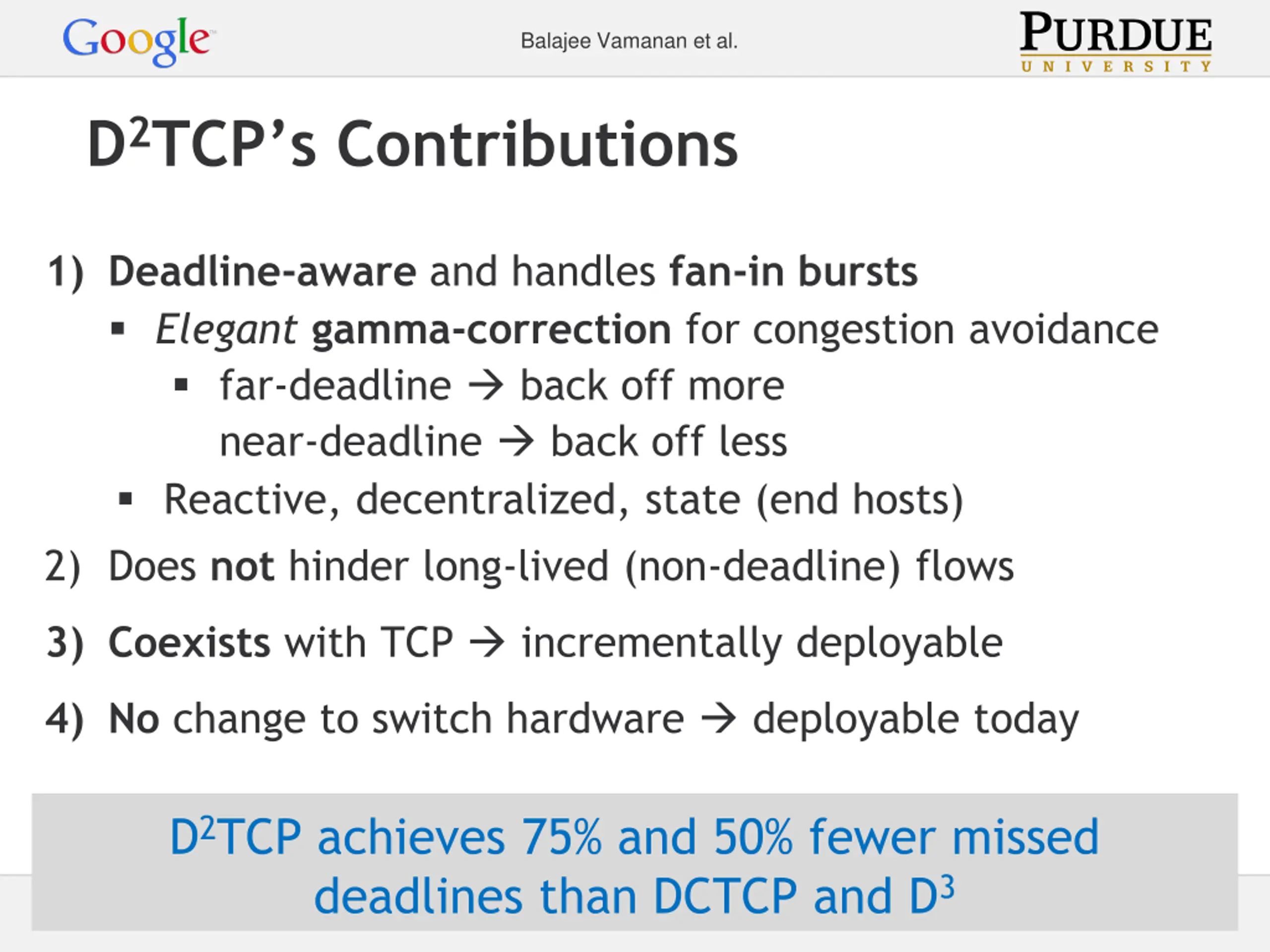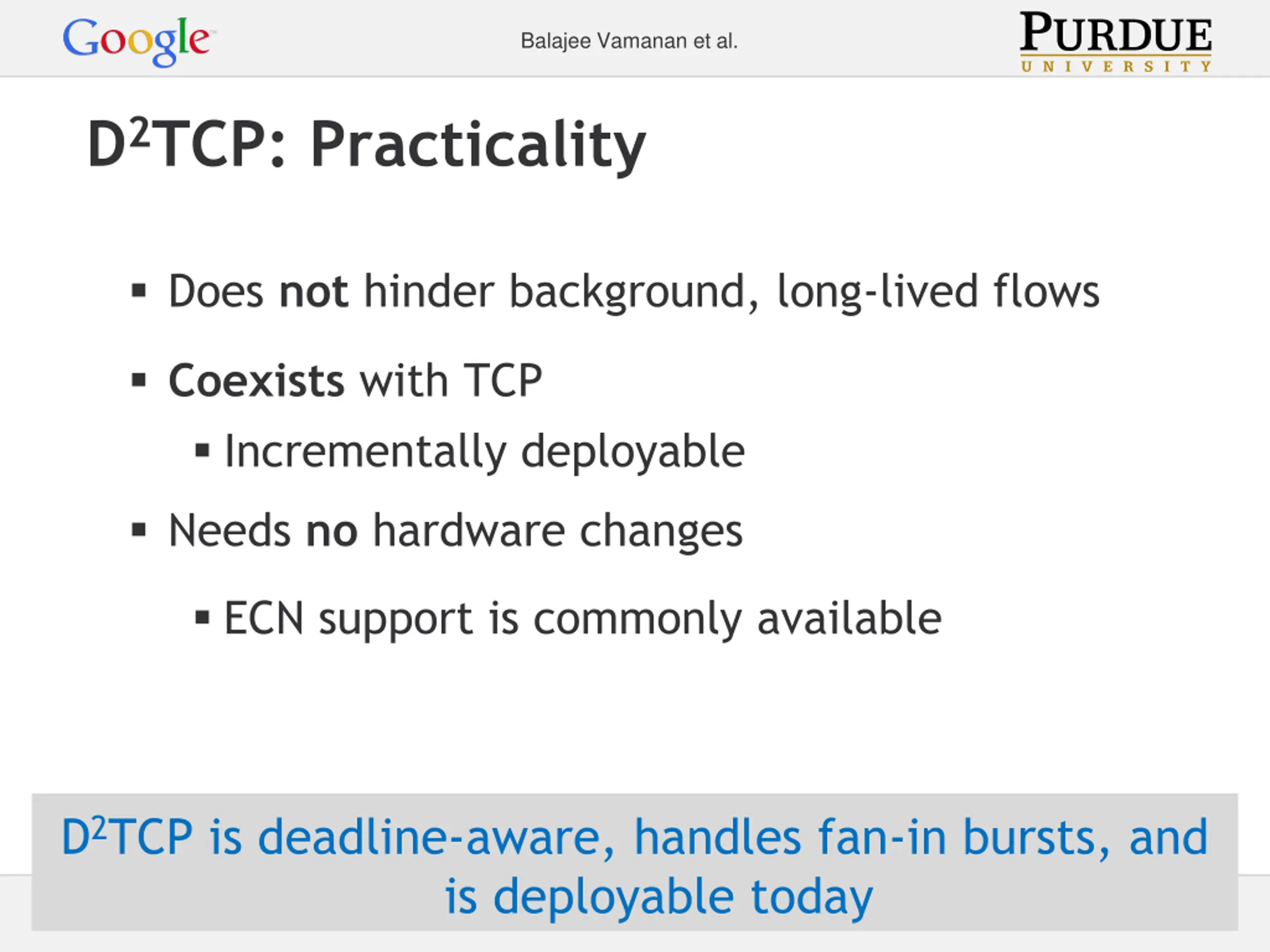 Balajee Vamanan et al. D2TCP: Practicality Does not hinder background, long-lived flows Coexists with TCP Incrementally deployable Needs no hardware changes ECN support is commonly available D2TCP is deadline-aware, handles fan-in bursts, and is deployable today