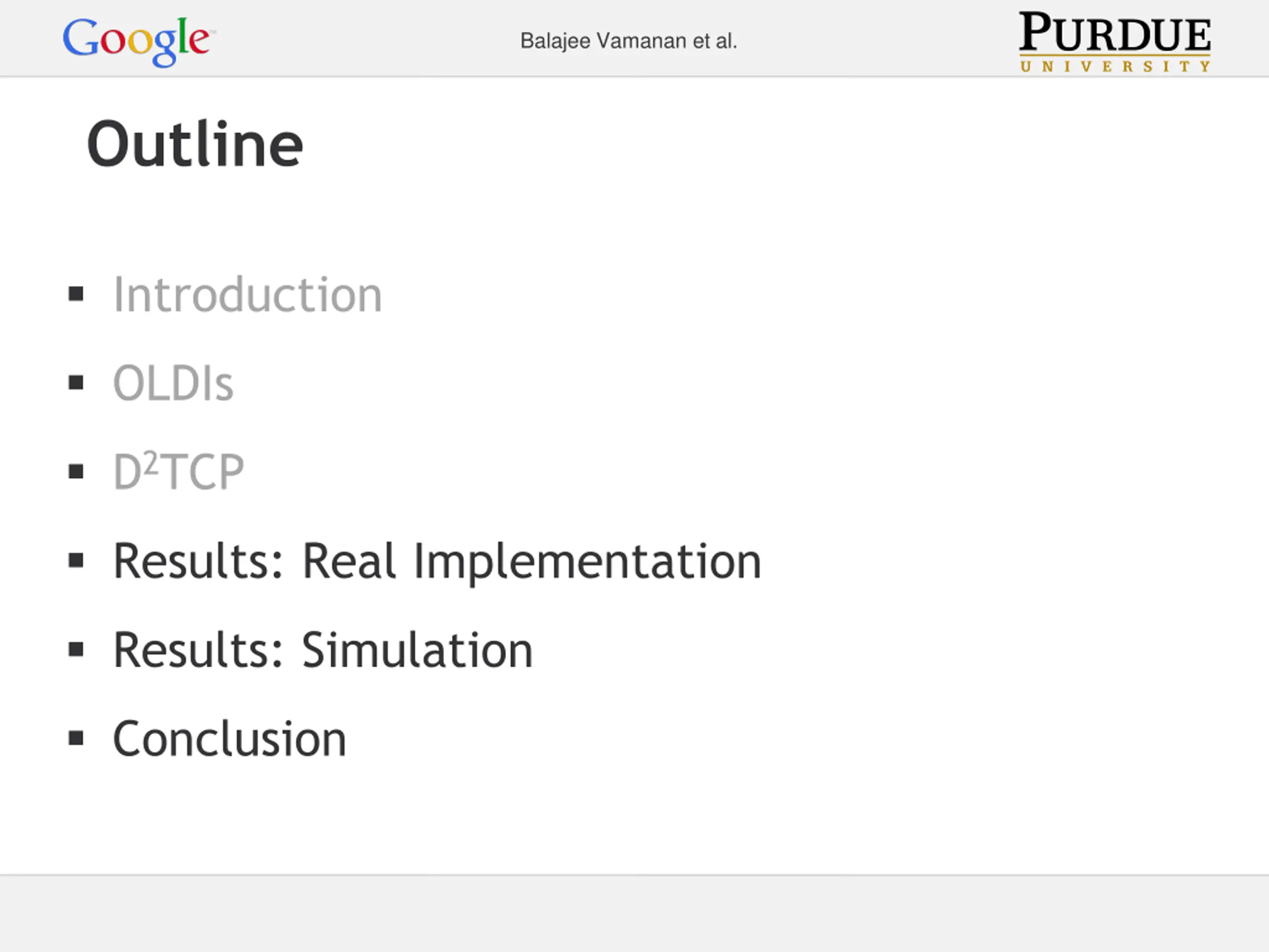 Balajee Vamanan et al. Outline Introduction OLDIs D2TCP Results: Real Implementation Results: Simulation Conclusion