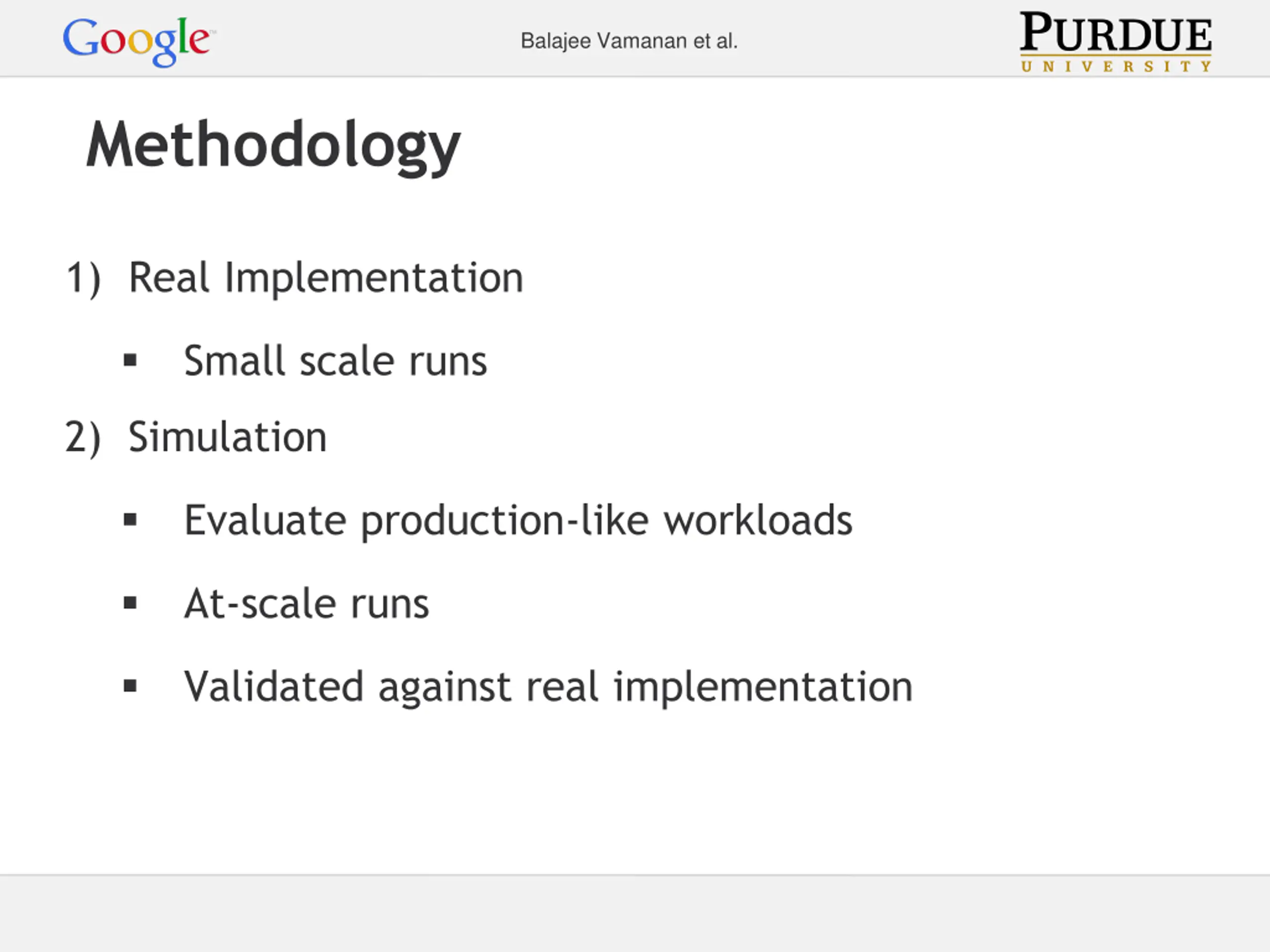 Balajee Vamanan et al. Methodology 1) Real Implementation Small scale runs 2) Simulation Evaluate production-like workloads At-scale runs Validated against real implementation