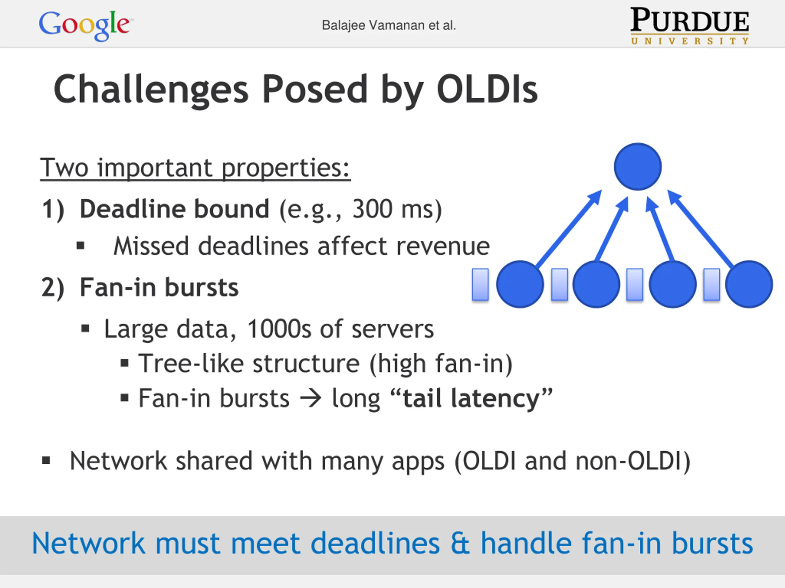 Balajee Vamanan et al. Challenges Posed by OLDIs Two important properties: 1) Deadline bound (e.g., 300 ms) Missed deadlines affect revenue 2) Fan-in bursts Large data, 1000s of servers Tree-like structure (high fan-in) Fan-in bursts long tail latency Network shared with many apps (OLDI and non-OLDI) Network must meet deadlines & handle fan-in bursts
