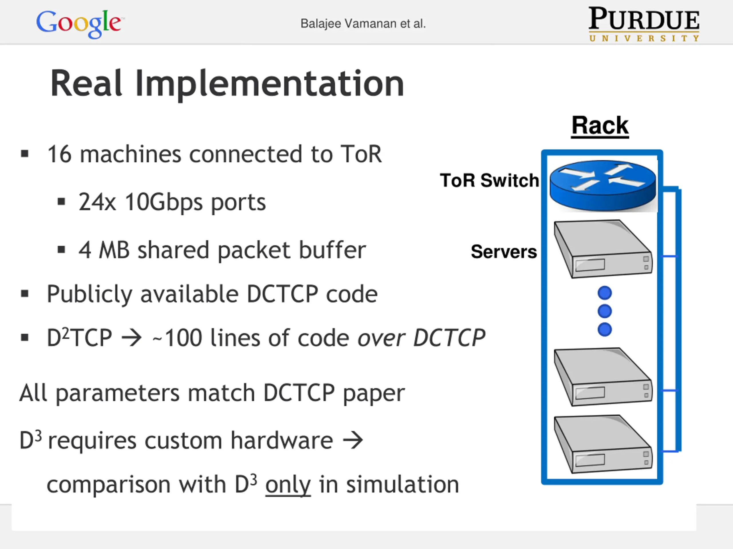 Balajee Vamanan et al. Real Implementation Rack 16 machines connected to ToR ToR Switch 24x 10Gbps ports 4 MB shared packet buffer Servers Publicly available DCTCP code D2TCP ~100 lines of code over DCTCP All parameters match DCTCP paper D3 requires custom hardware comparison with D3only in simulation