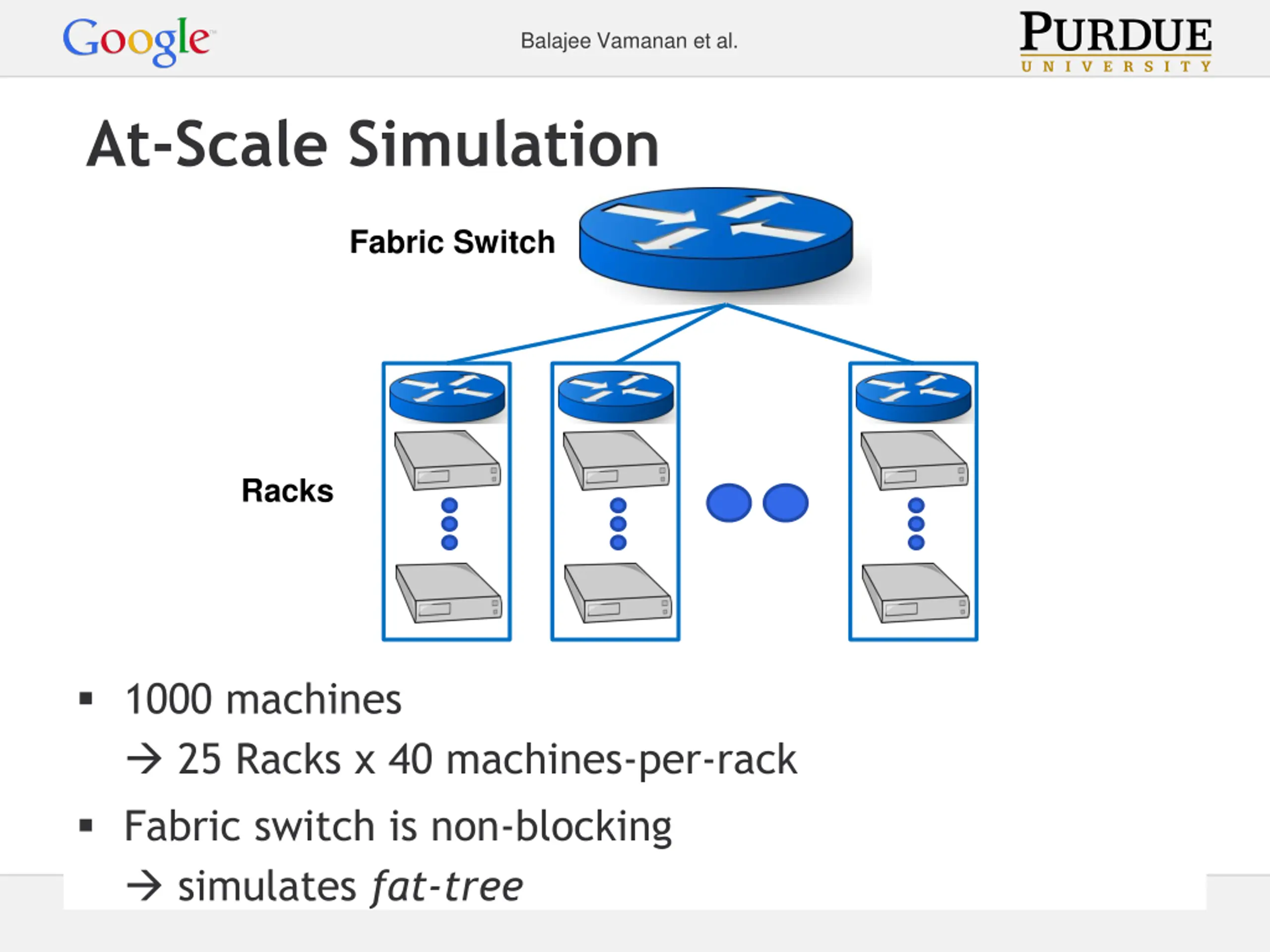 Balajee Vamanan et al. At-Scale Simulation Fabric Switch Racks 1000 machines 25 Racks x 40 machines-per-rack Fabric switch is non-blocking simulates fat-tree