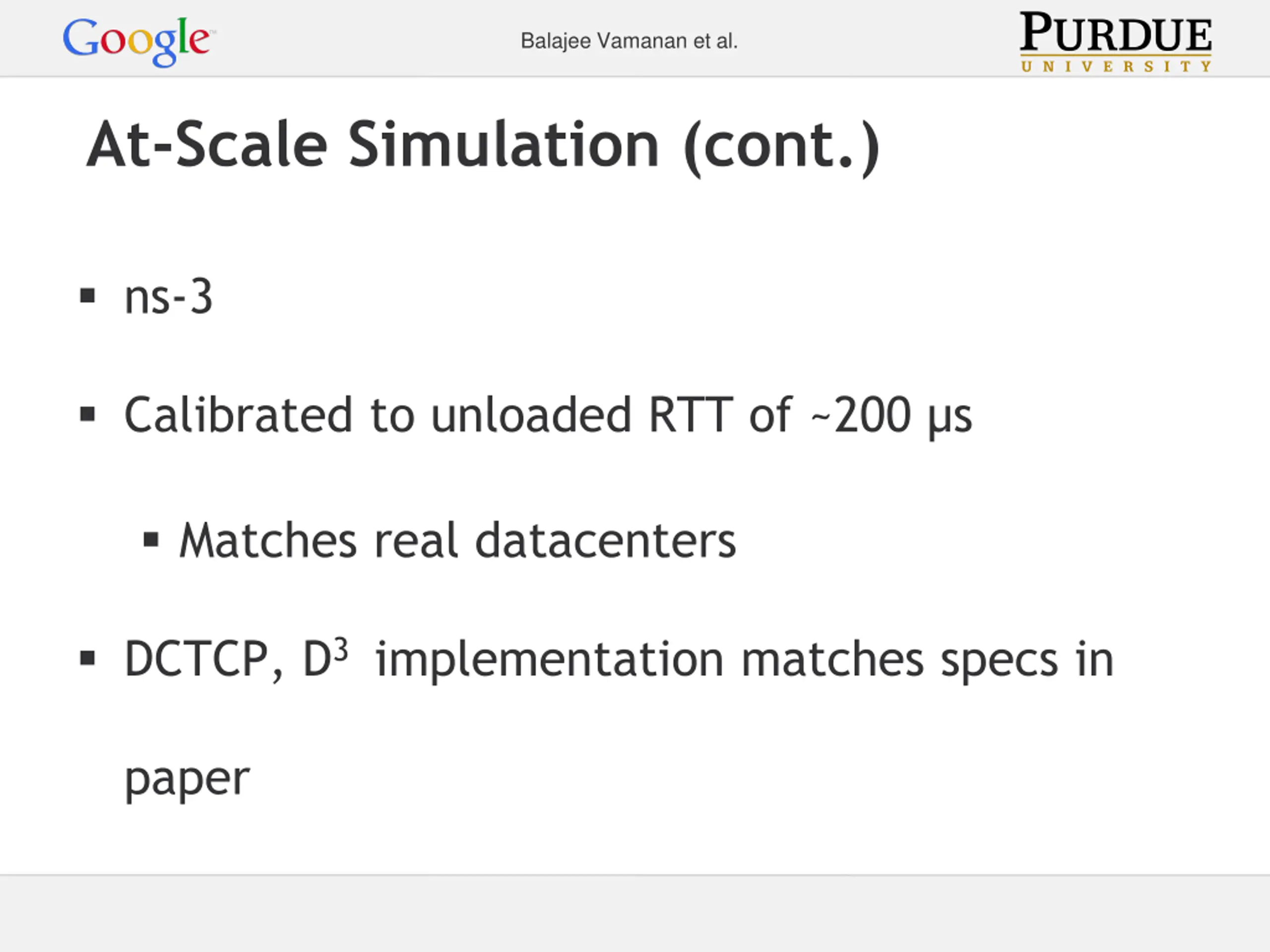 Balajee Vamanan et al. At-Scale Simulation (cont.) ns-3 Calibrated to unloaded RTT of ~200 s Matches real datacenters DCTCP, D3 implementation matches specs in paper