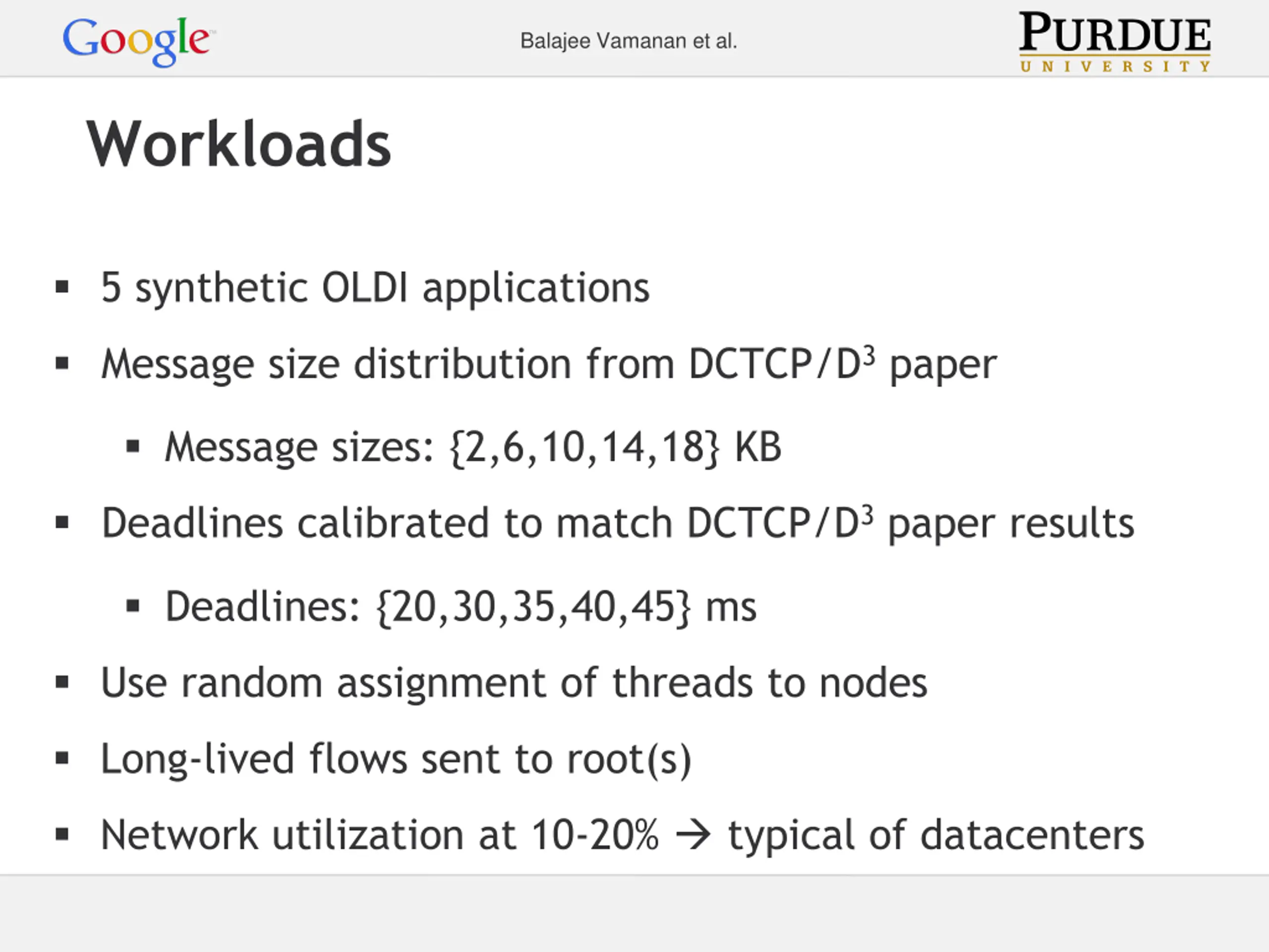 Balajee Vamanan et al. Workloads 5 synthetic OLDI applications Message size distribution from DCTCP/D3paper Message sizes: {2,6,10,14,18} KB Deadlines calibrated to match DCTCP/D3paper results Deadlines: {20,30,35,40,45} ms Use random assignment of threads to nodes Long-lived flows sent to root(s) Network utilization at 10-20% typical of datacenters