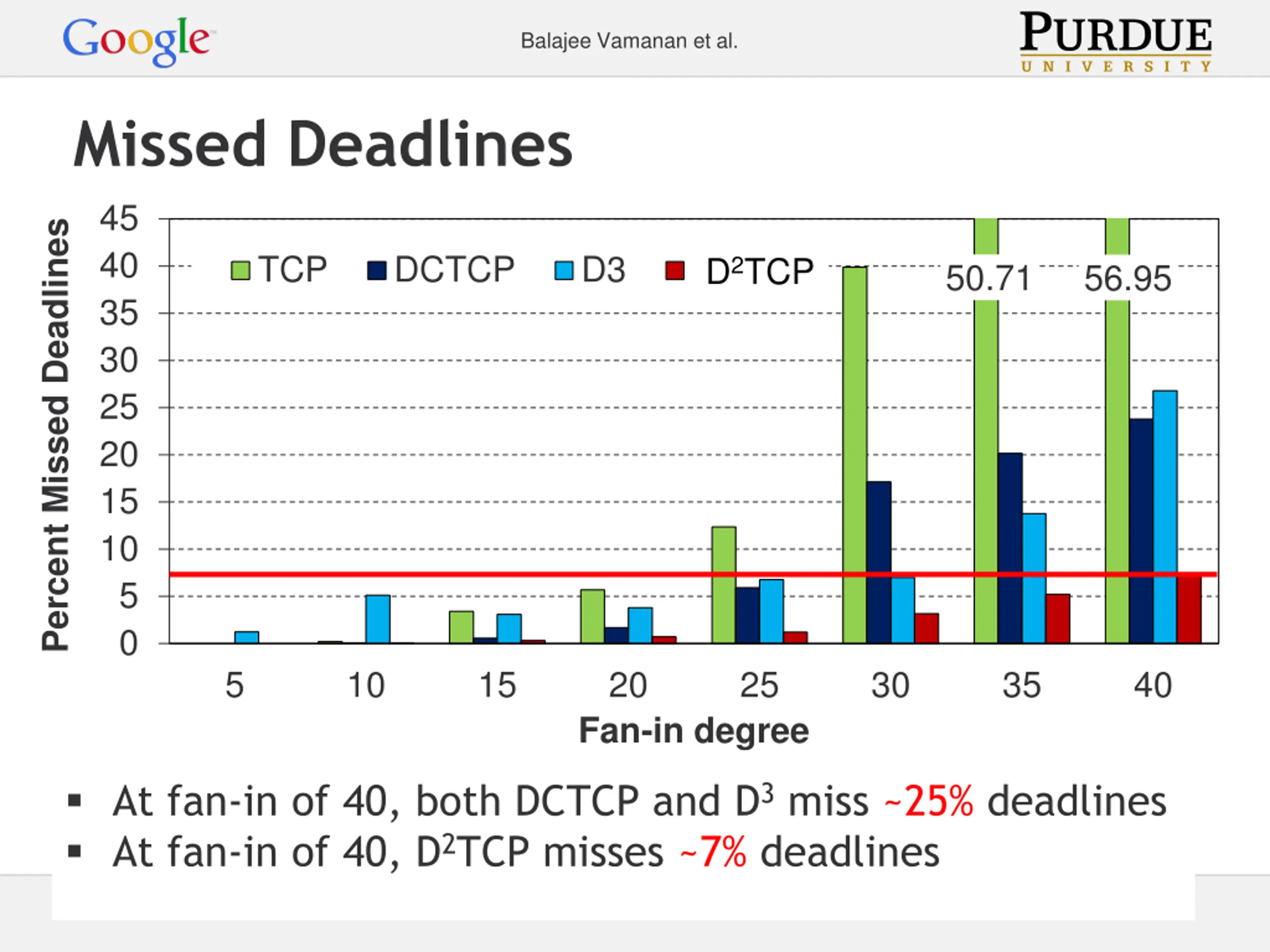 Balajee Vamanan et al. Missed Deadlines 45 Percent Missed Deadlines 40 TCP DCTCP D3 D2 D2TCP 50.71 56.95 35 30 25 20 15 10 5 0 5 10 15 20 25 30 35 40 Fan-in degree At fan-in of 40, both DCTCP and D3miss ~25% deadlines At fan-in of 40, D2TCP misses ~7% deadlines