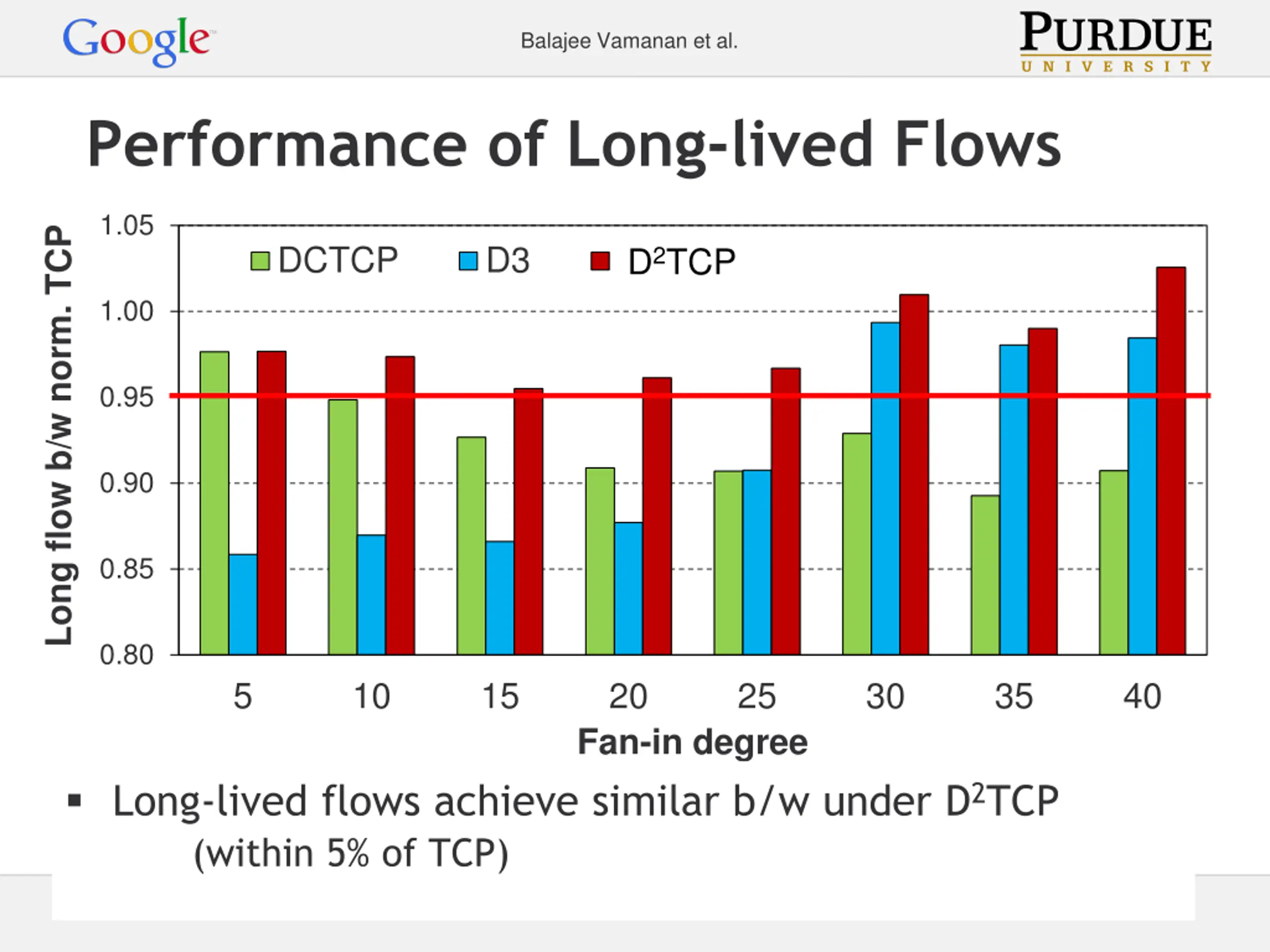 Balajee Vamanan et al. Performance of Long-lived Flows 1.05 Long flow b/w norm. TCP DCTCP D3 OTCP D2TCP 1.00 0.95 0.90 0.85 0.80 5 10 15 20 25 30 35 40 Fan-in degree Long-lived flows achieve similar b/w under D2TCP (within 5% of TCP)