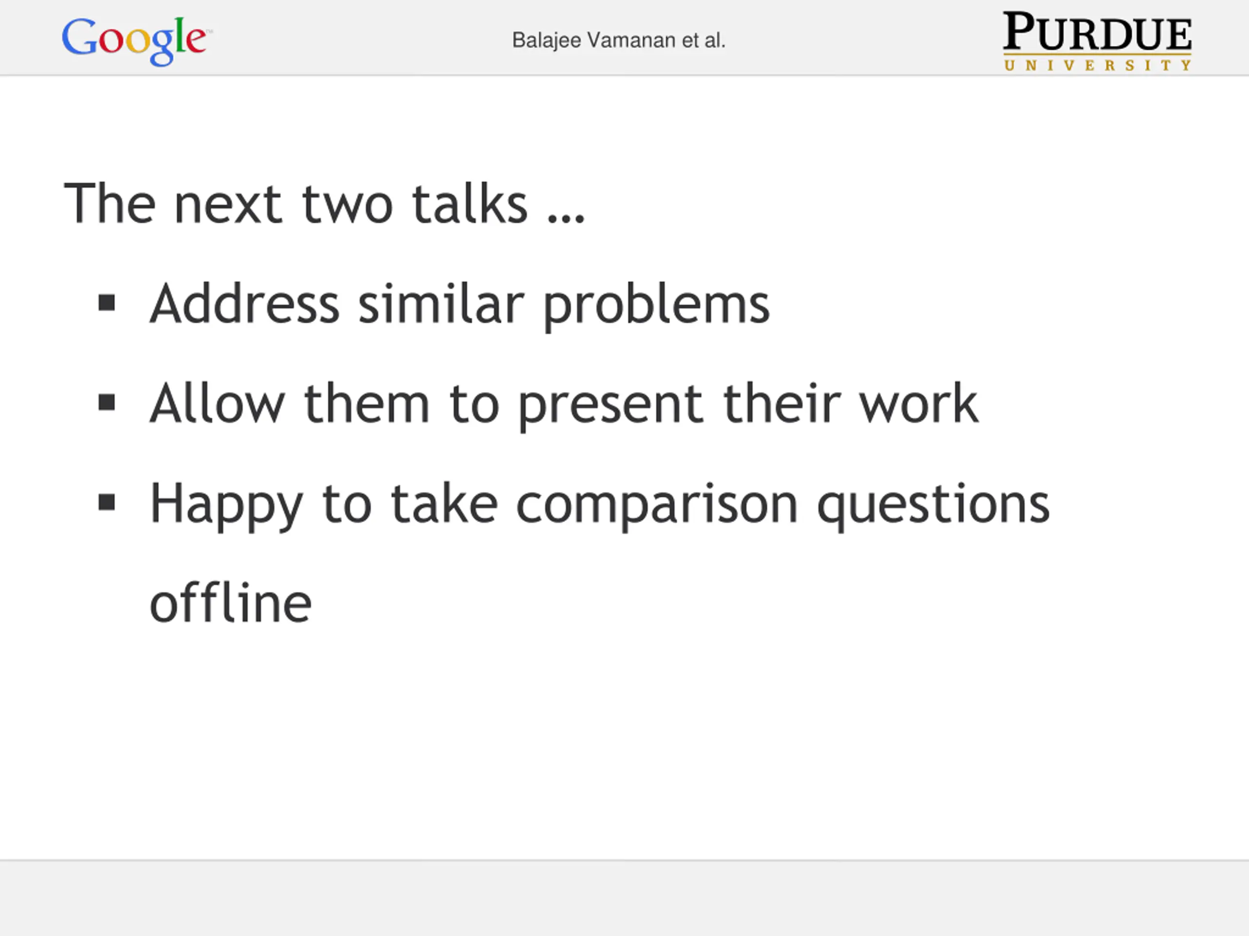 Balajee Vamanan et al. The next two talks Address similar problems Allow them to present their work Happy to take comparison questions offline