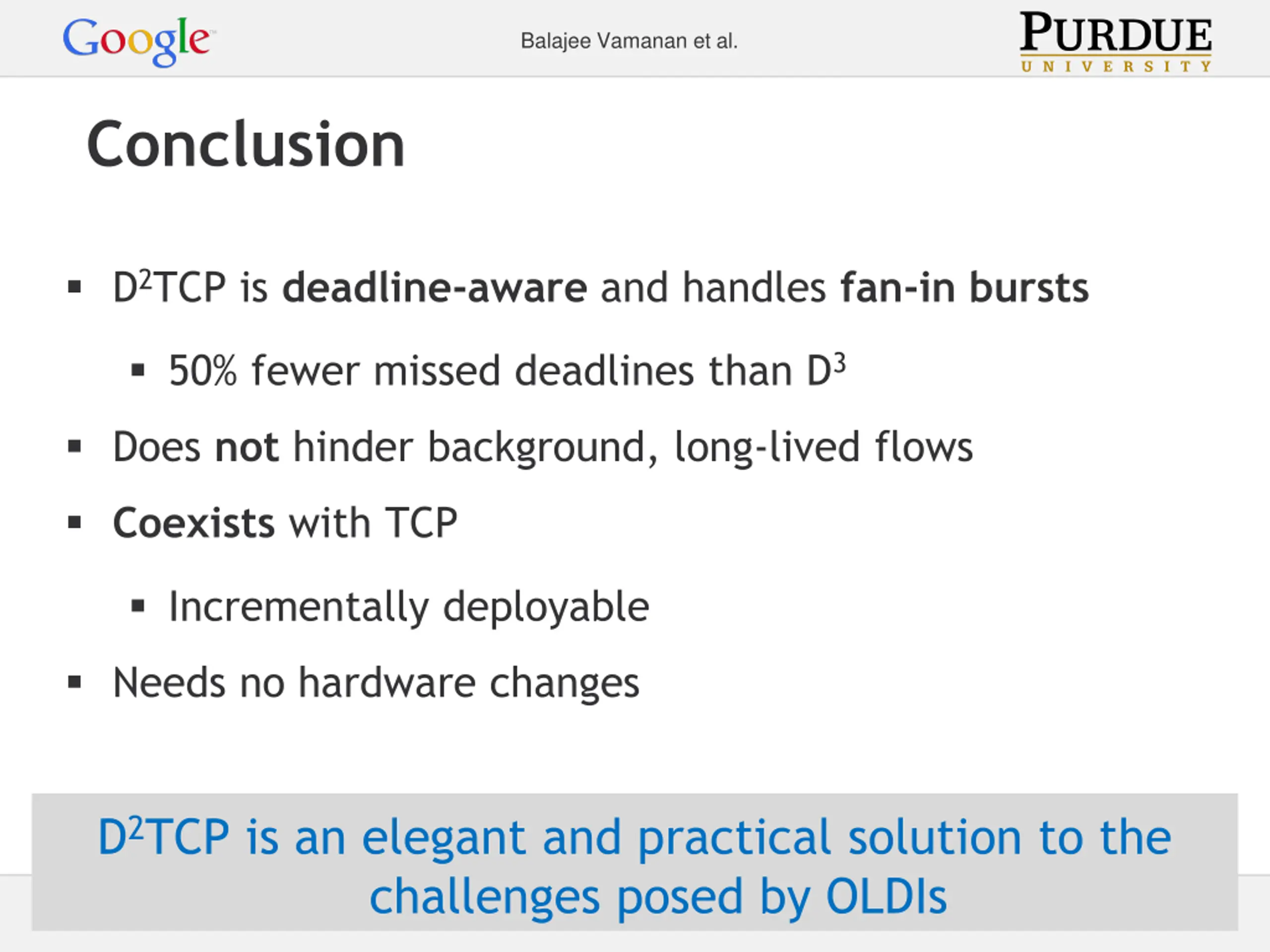 Balajee Vamanan et al. Conclusion D2TCP is deadline-aware and handles fan-in bursts 50% fewer missed deadlines than D3 Does not hinder background, long-lived flows Coexists with TCP Incrementally deployable Needs no hardware changes D2TCP is an elegant and practical solution to the challenges posed by OLDIs