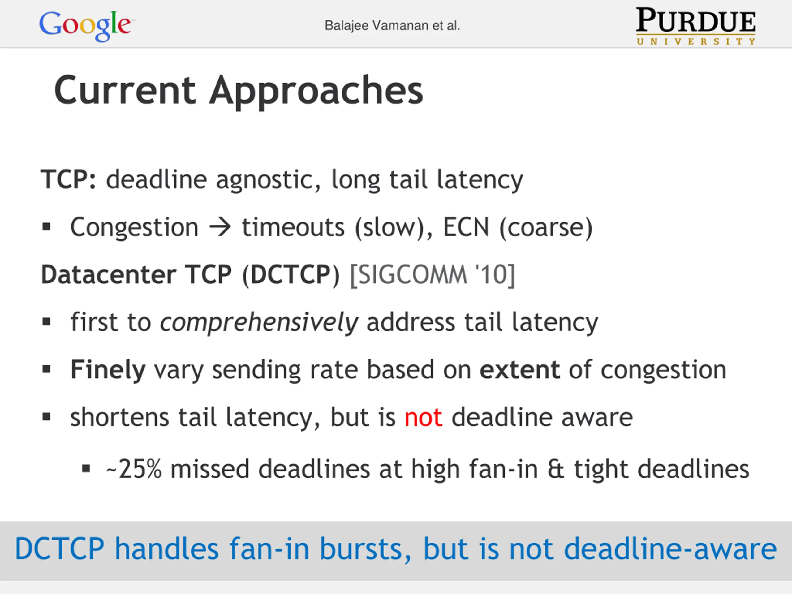 Balajee Vamanan et al. Current Approaches TCP: deadline agnostic, long tail latency Congestion timeouts (slow), ECN (coarse) Datacenter TCP (DCTCP) [SIGCOMM '10] first to comprehensively address tail latency Finely vary sending rate based on extent of congestion shortens tail latency, but is not deadline aware ~25% missed deadlines at high fan-in & tight deadlines DCTCP handles fan-in bursts, but is not deadline-aware
