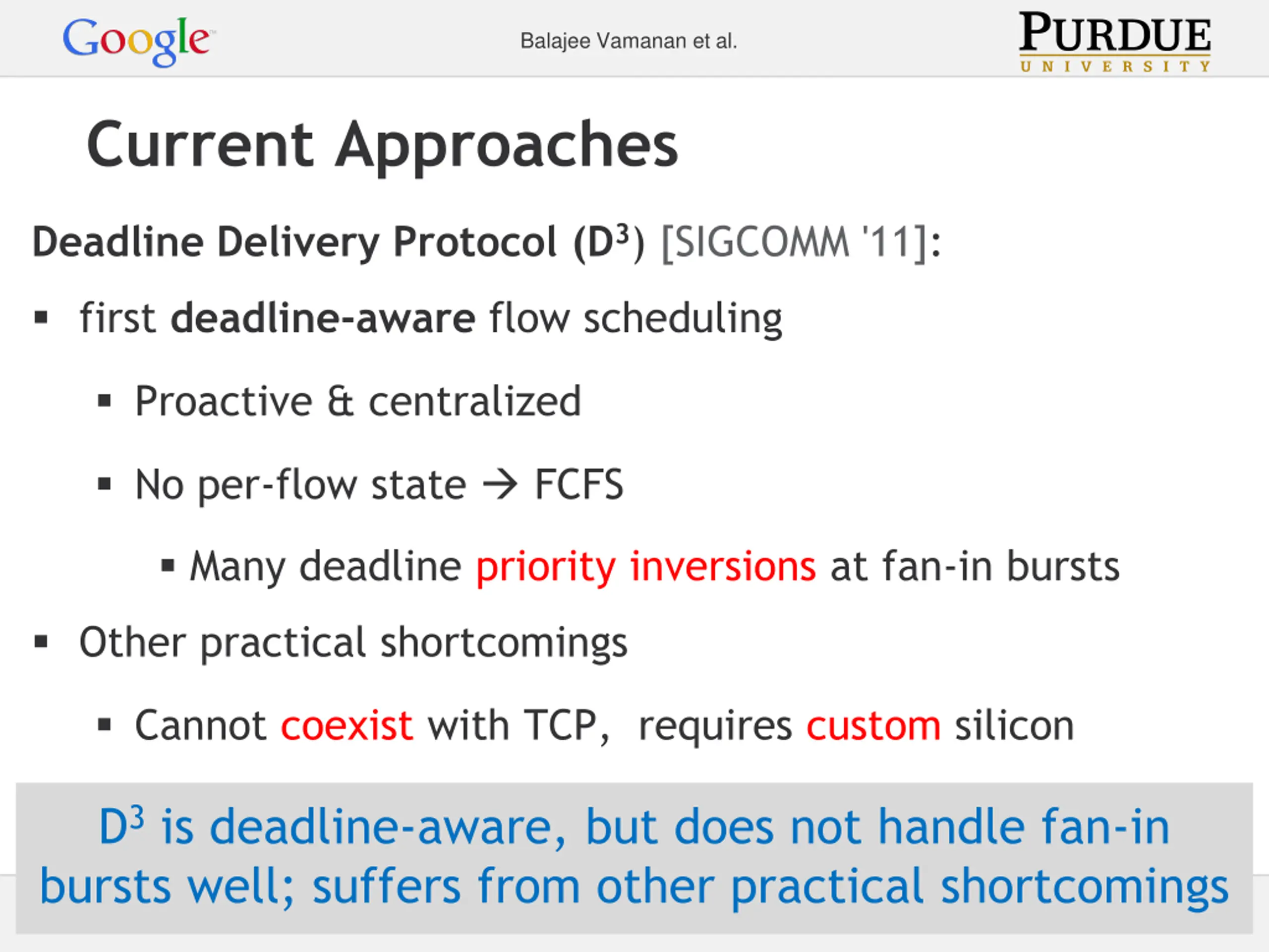 Balajee Vamanan et al. Current Approaches Deadline Delivery Protocol (D3) [SIGCOMM '11]: first deadline-aware flow scheduling Proactive & centralized No per-flow state FCFS Many deadline priority inversions at fan-in bursts Other practical shortcomings Cannot coexist with TCP, requires custom silicon D3is deadline-aware, but does not handle fan-in bursts well; suffers from other practical shortcomings