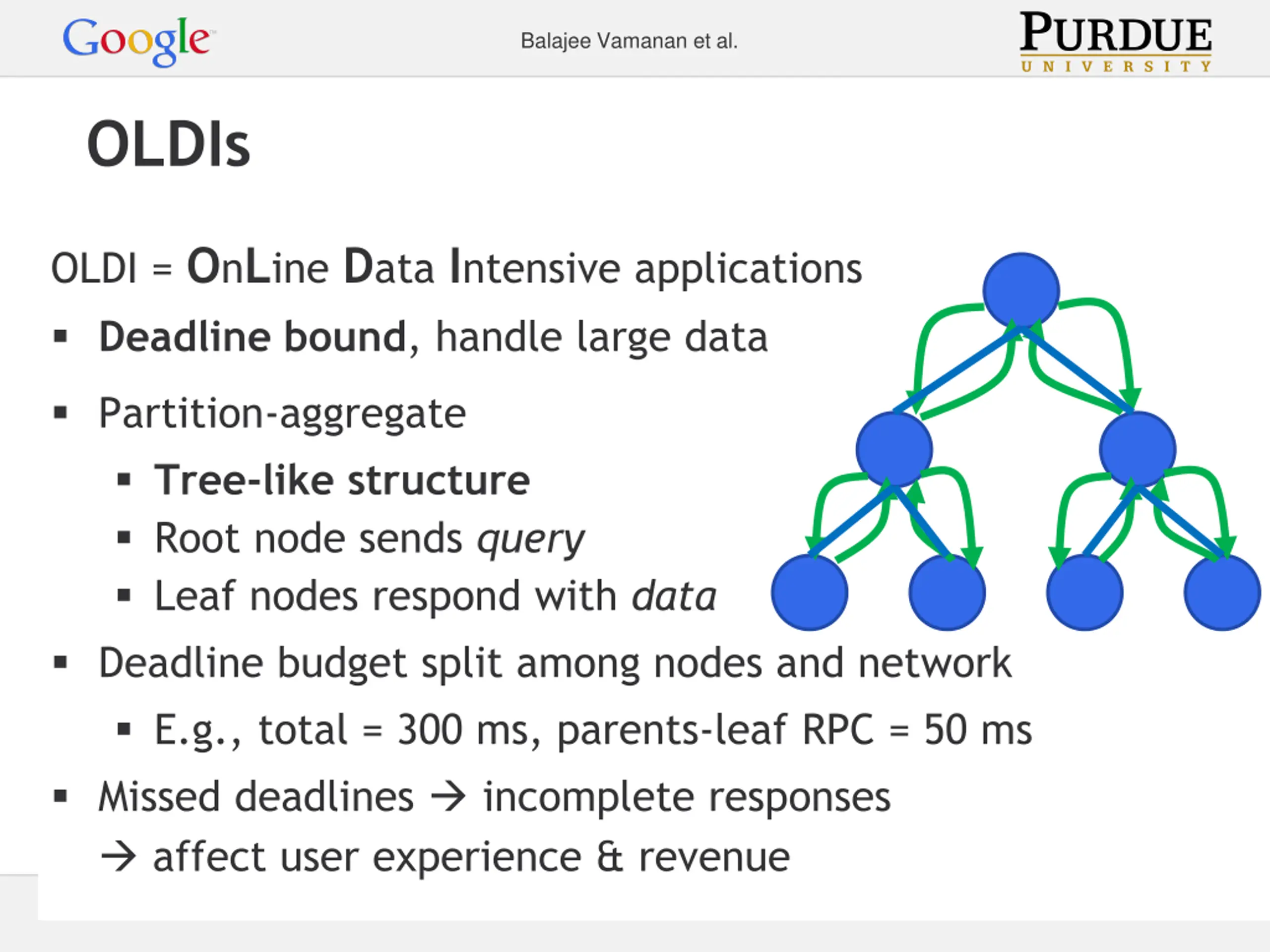 Balajee Vamanan et al. OLDIs OLDI = OnLine Data Intensive applications Deadline bound, handle large data Partition-aggregate Tree-like structure Root node sends query Leaf nodes respond with data Deadline budget split among nodes and network E.g., total = 300 ms, parents-leaf RPC = 50 ms Missed deadlines incomplete responses affect user experience & revenue