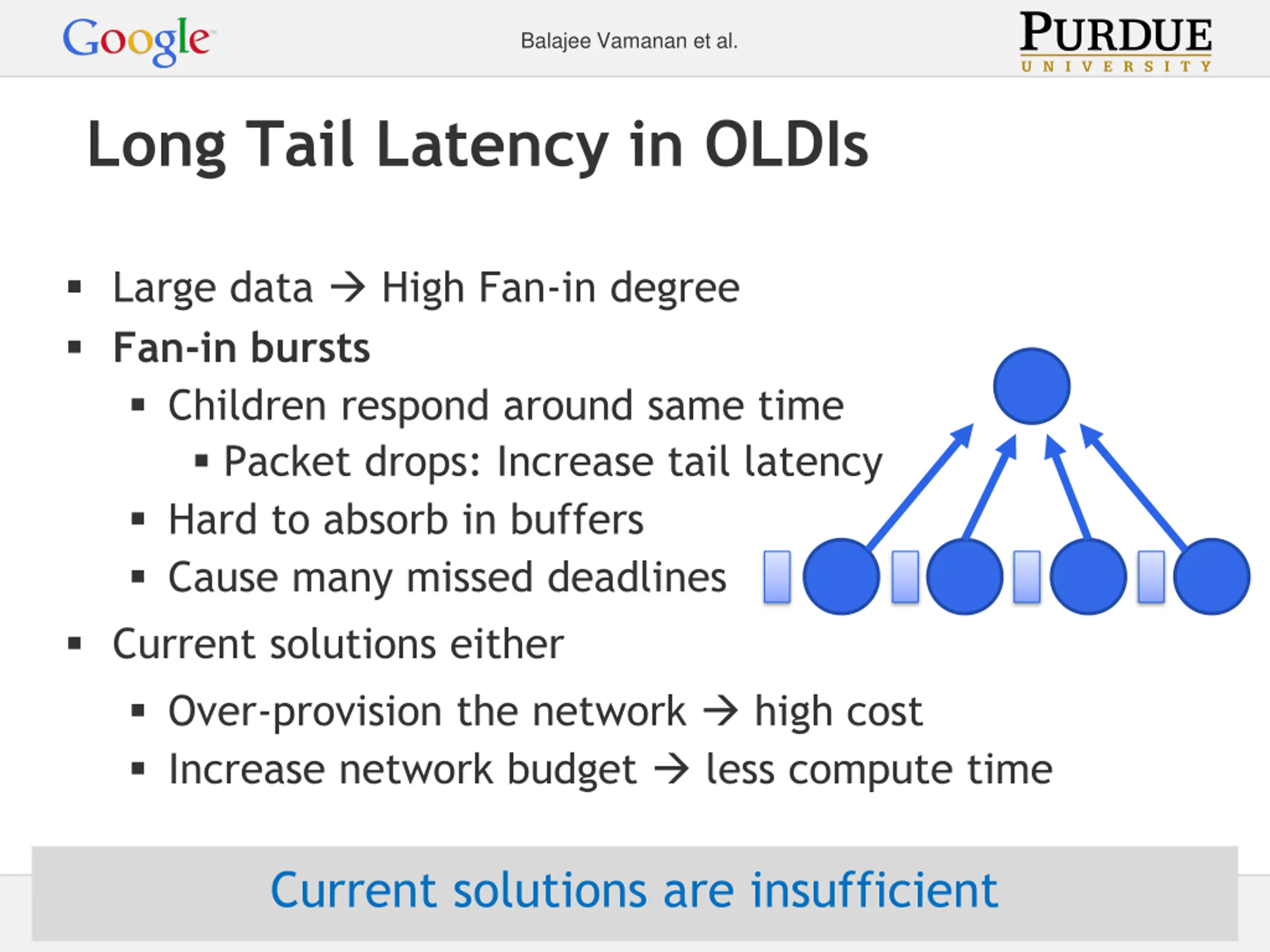 Balajee Vamanan et al. Long Tail Latency in OLDIs Large data High Fan-in degree Fan-in bursts Children respond around same time Packet drops: Increase tail latency Hard to absorb in buffers Cause many missed deadlines Current solutions either Over-provision the network high cost Increase network budget less compute time Current solutions are insufficient