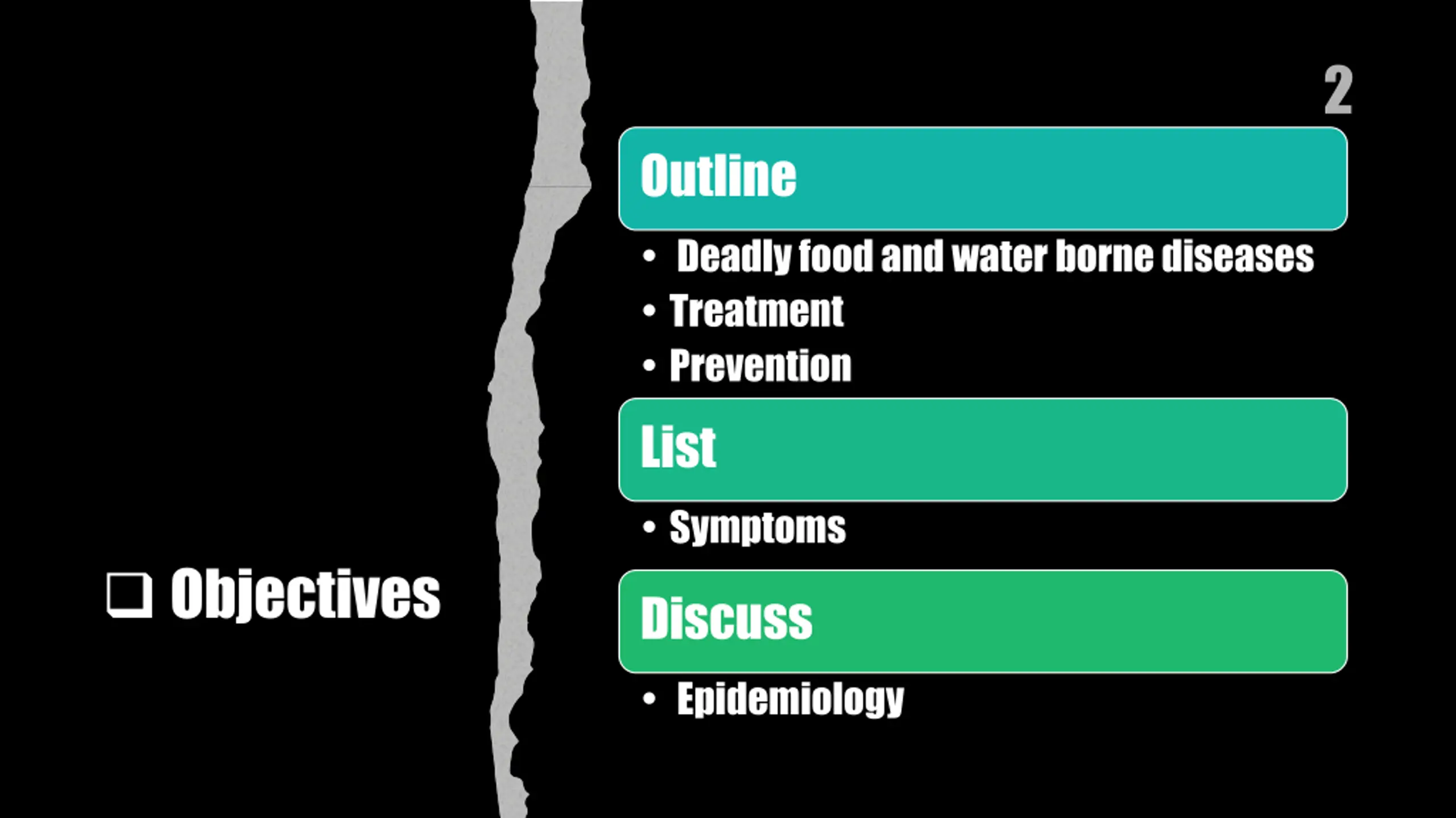Outline Deadly food and water borne diseases Treatment Prevention List Symptoms Objectives Discuss Epidemiology