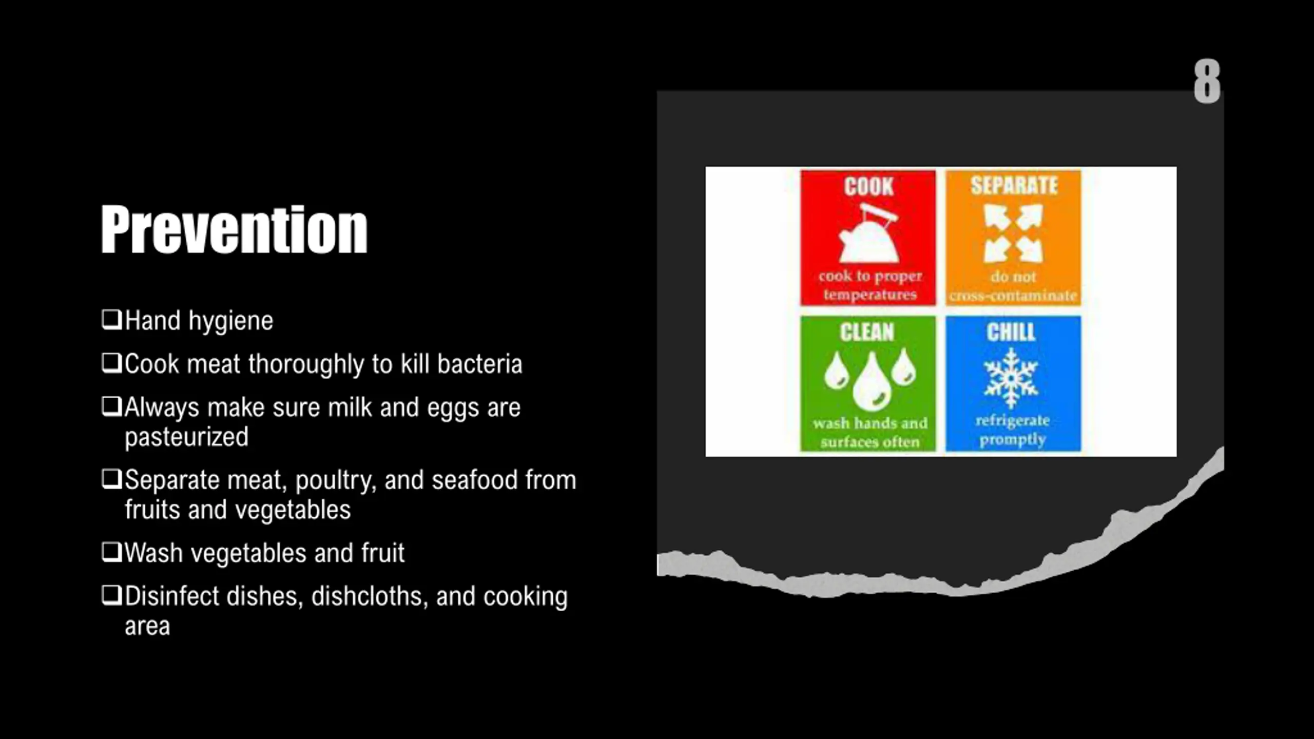 Prevention Hand hygiene Cook meat thoroughly to kill bacteria Always make sure milk and eggs are pasteurized Separate meat, poultry, and seafood from fruits and vegetables Wash vegetables and fruit Disinfect dishes, dishcloths, and cooking area