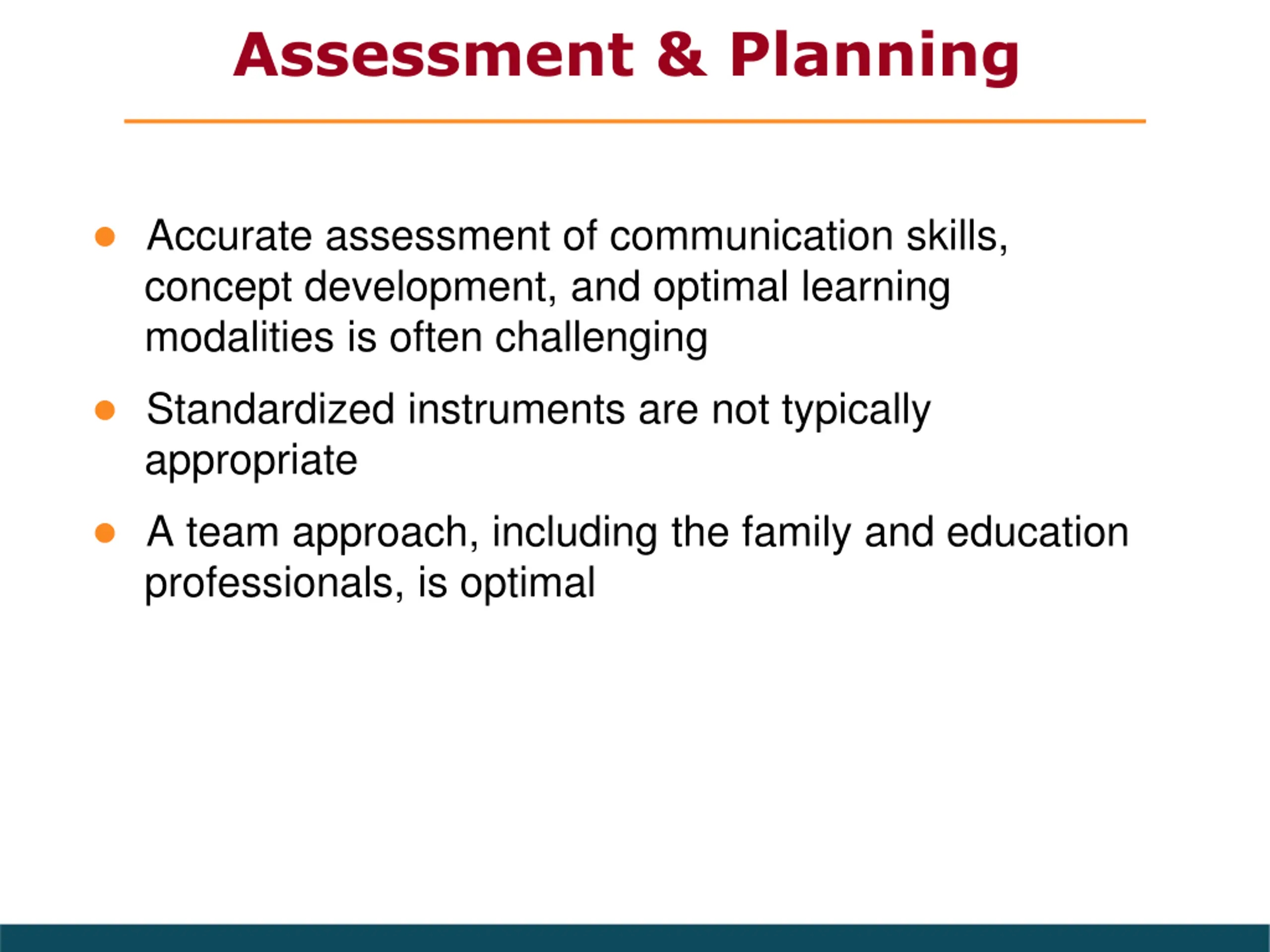 Assessment & Planning Accurate assessment of communication skills, concept development, and optimal learning modalities is often challenging Standardized instruments are not typically appropriate A team approach, including the family and education professionals, is optimal