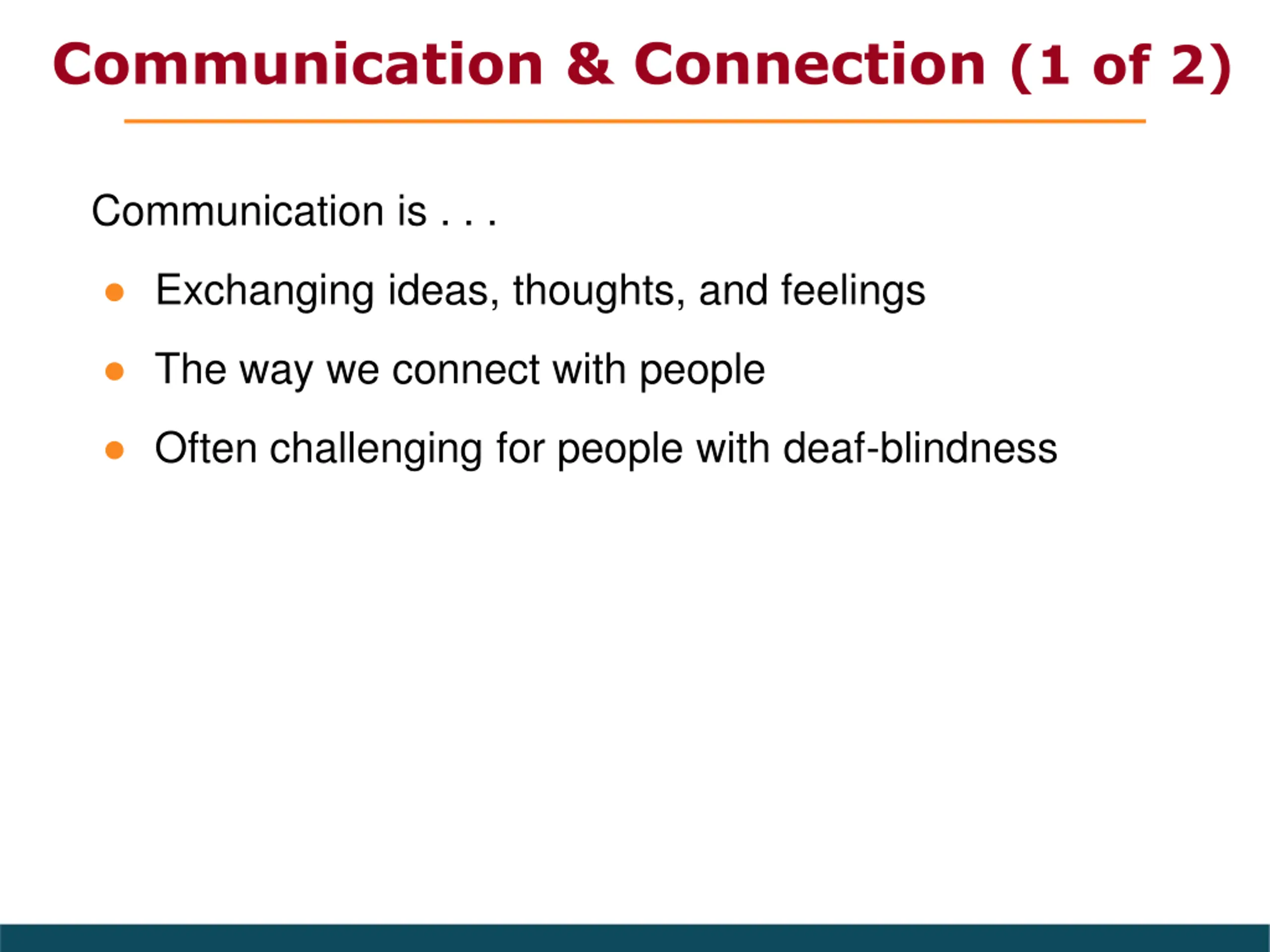 Communication & Connection (1 of 2) Communication is . . . Exchanging ideas, thoughts, and feelings The way we connect with people Often challenging for people with deaf-blindness
