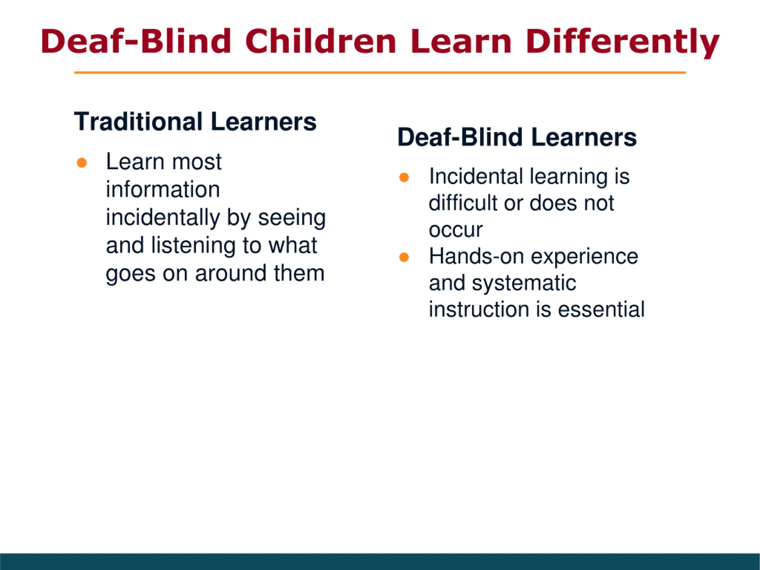 Deaf-Blind Children Learn Differently Traditional Learners Learn most information incidentally by seeing and listening to what goes on around them Deaf-Blind Learners Incidental learning is difficult or does not occur Hands-on experience and systematic instruction is essential