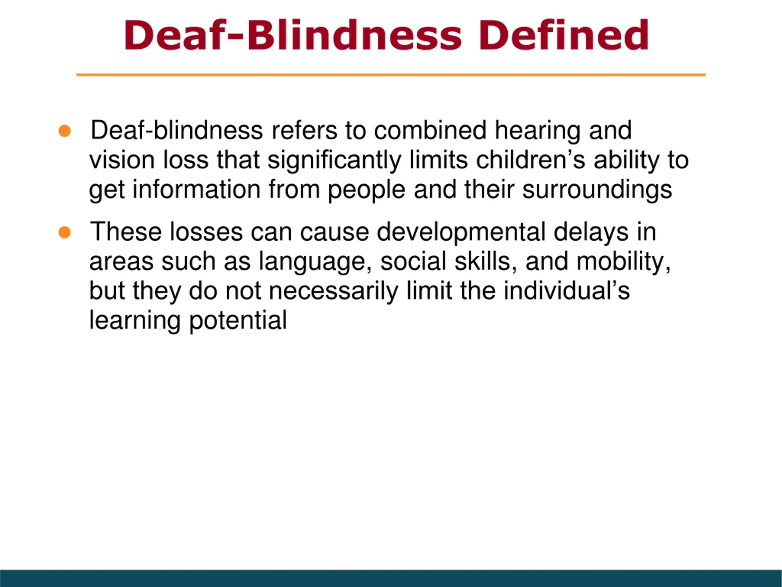 Deaf-Blindness Defined Deaf-blindness refers to combined hearing and vision loss that significantly limits children s ability to get information from people and their surroundings These losses can cause developmental delays in areas such as language, social skills, and mobility, but they do not necessarily limit the individual s learning potential