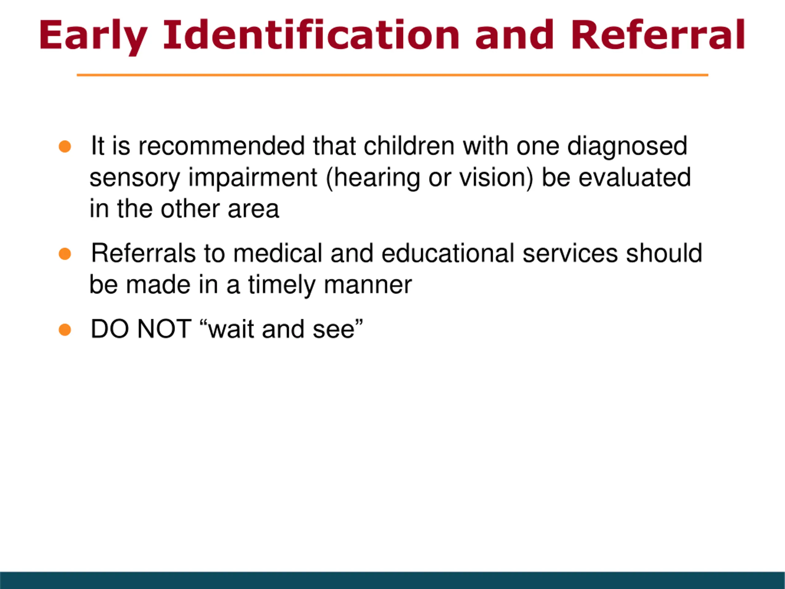 Early Identification and Referral It is recommended that children with one diagnosed sensory impairment (hearing or vision) be evaluated in the other area Referrals to medical and educational services should be made in a timely manner DO NOT wait and see