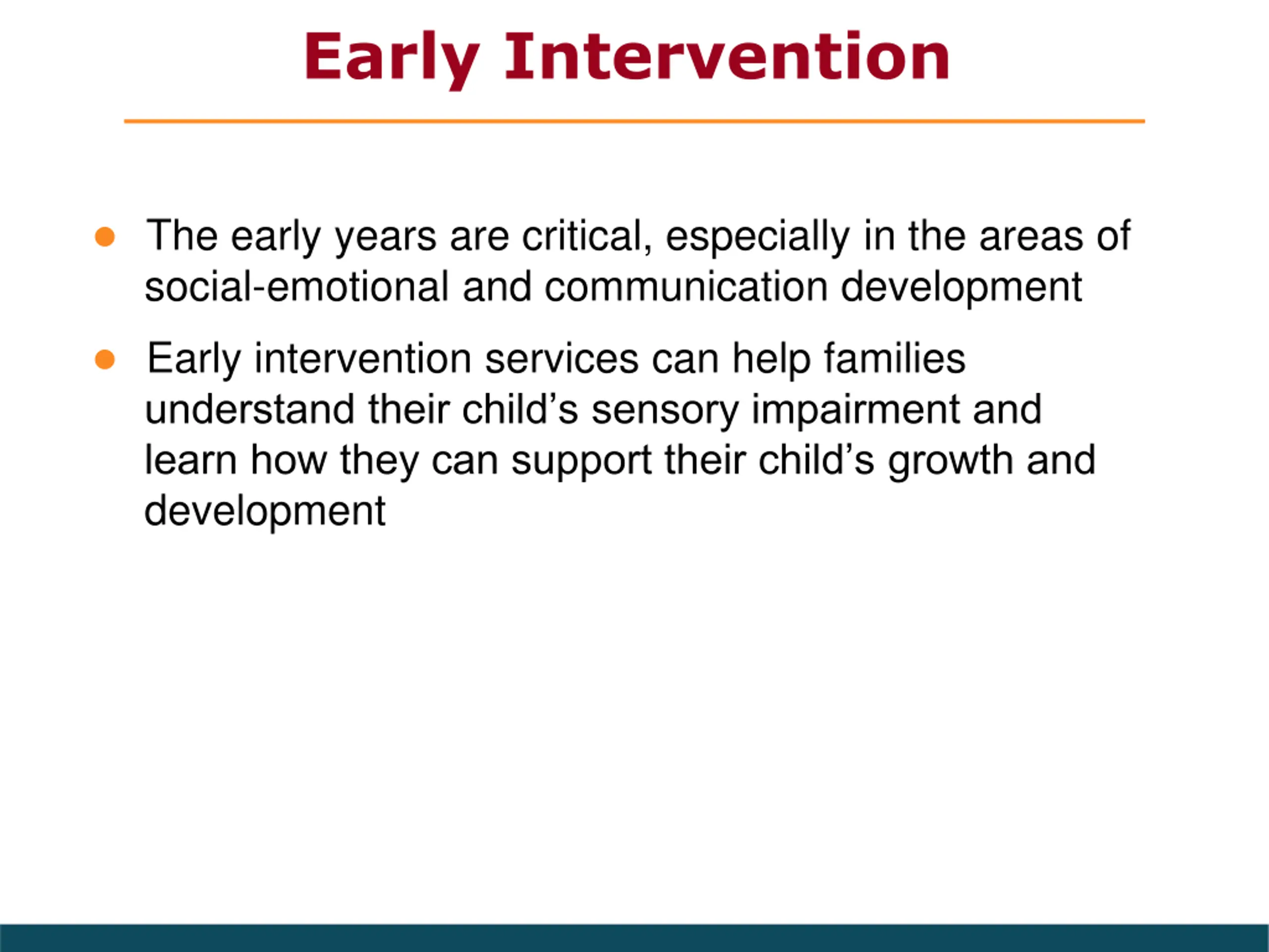Early Intervention The early years are critical, especially in the areas of social-emotional and communication development Early intervention services can help families understand their child s sensory impairment and learn how they can support their child s growth and development